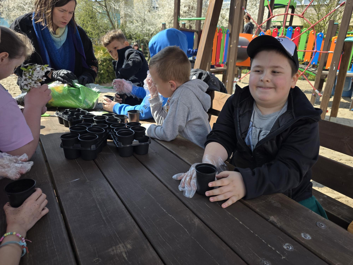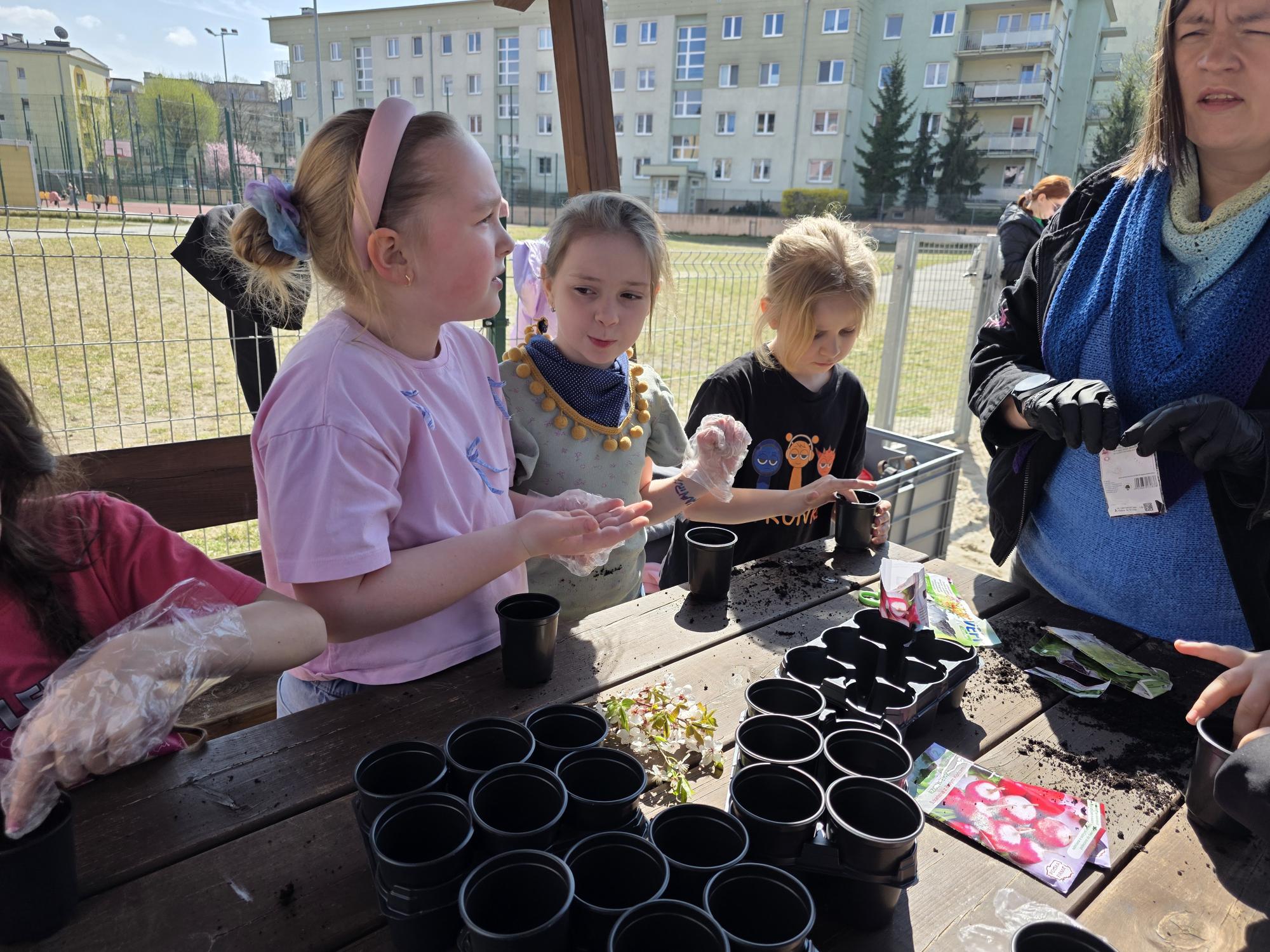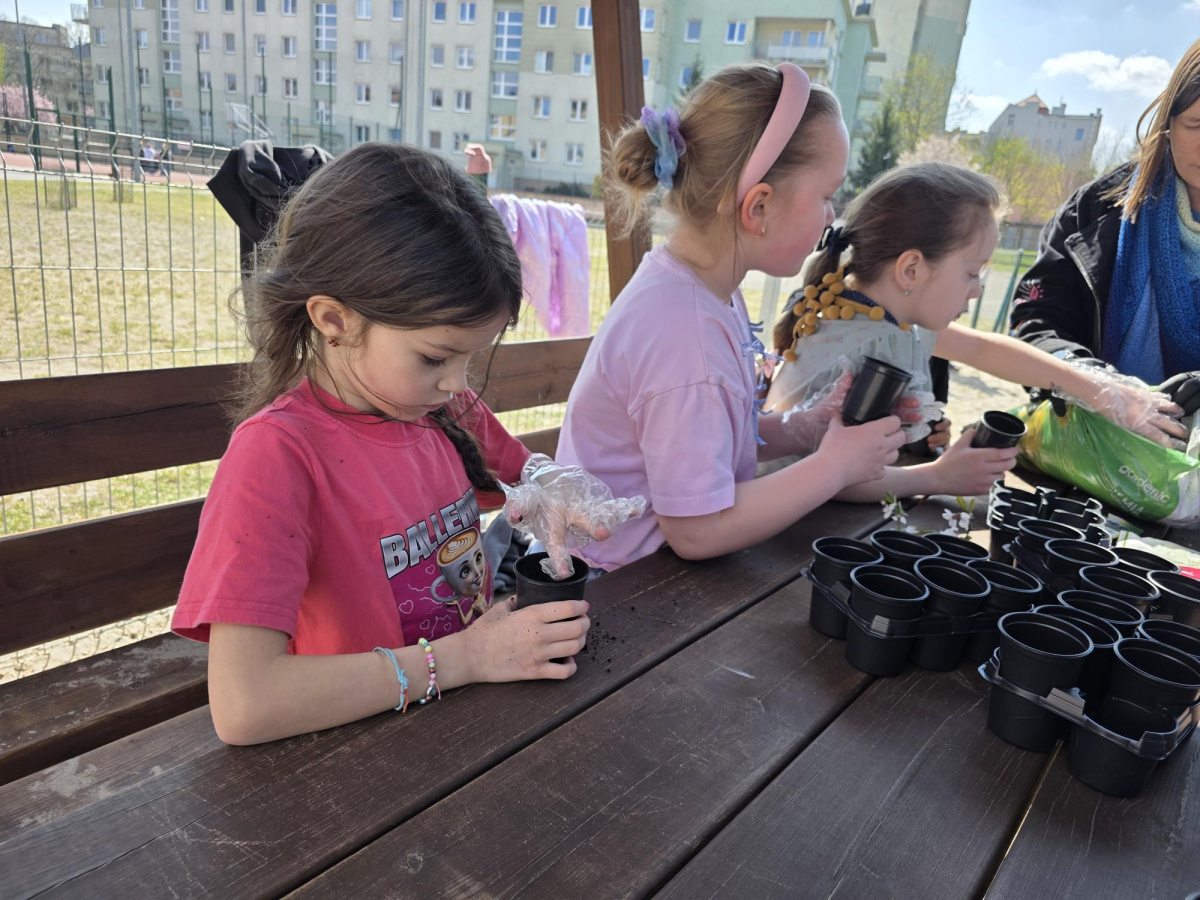 Uczniowie klasy 1c korzystając z pięknej pogody wysiewali nasionka w doniczkach do klasowego ogródka na parapecie. Teraz będziemy troszczyć się o nasze roślinki i obserwować czy coś nam już kiełkuje.