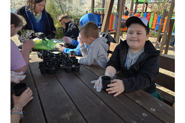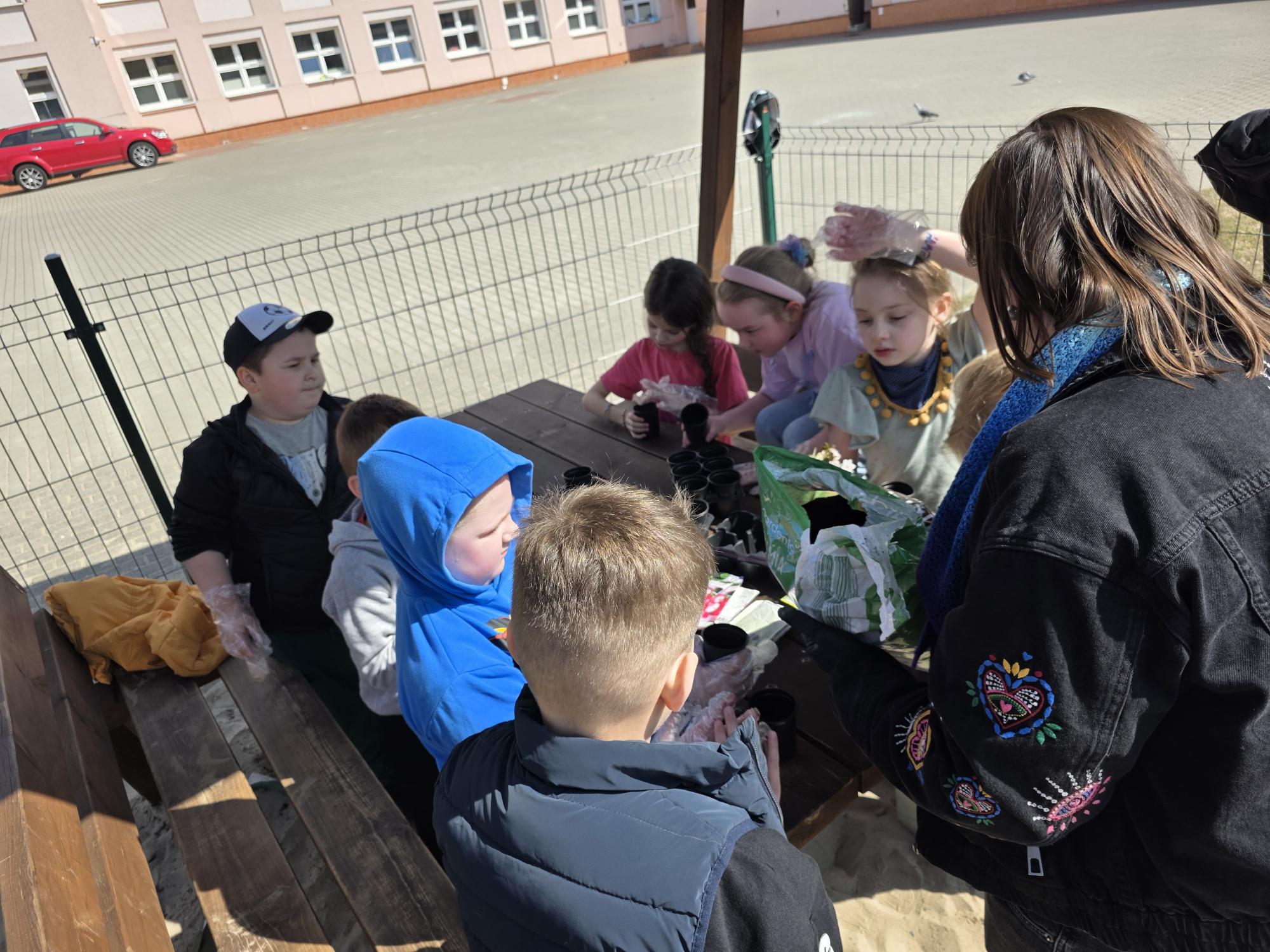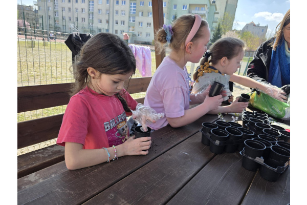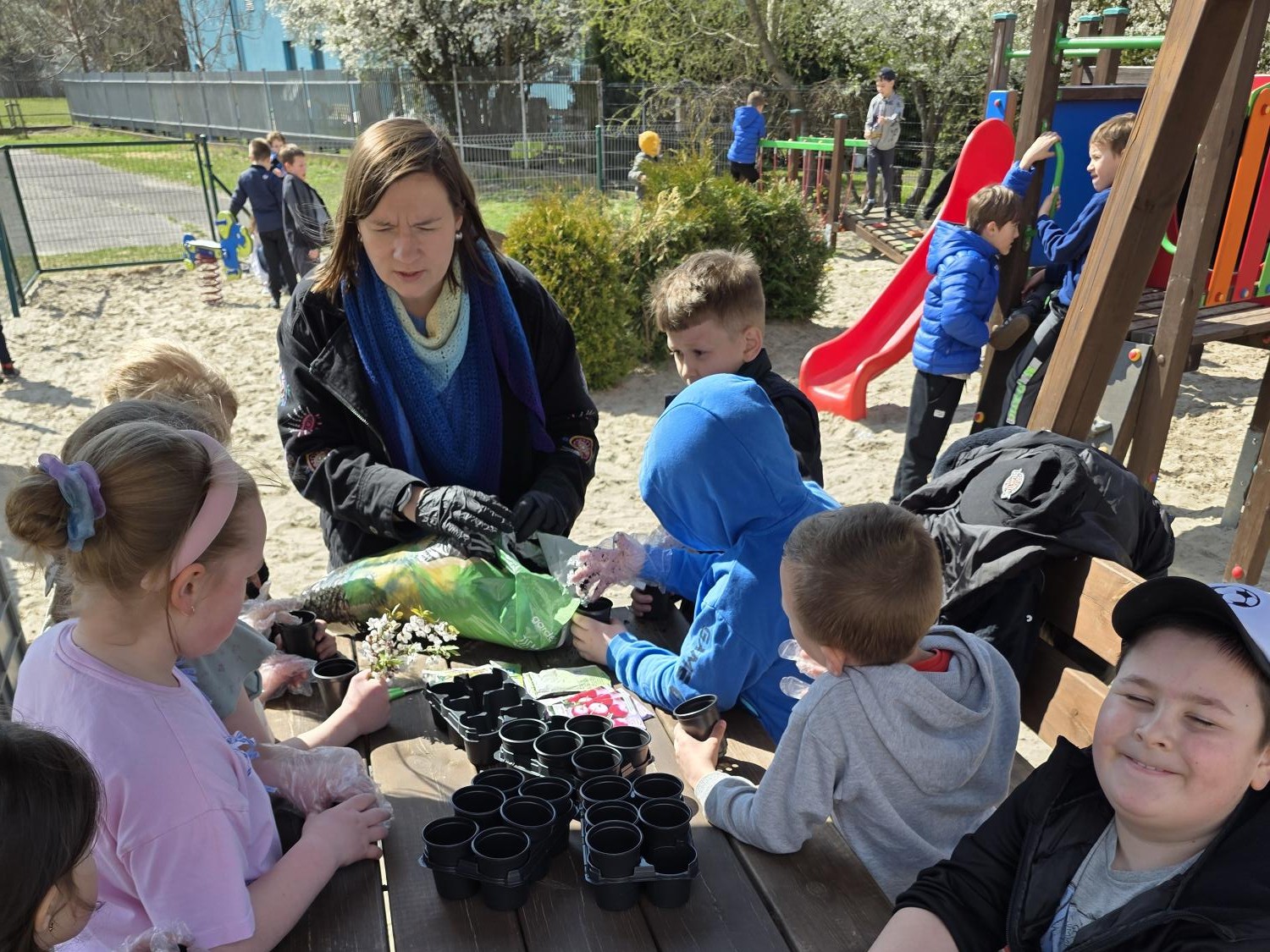 Uczniowie klasy 1c korzystając z pięknej pogody wysiewali nasionka w doniczkach do klasowego ogródka na parapecie. Teraz będziemy troszczyć się o nasze roślinki i obserwować czy coś nam już kiełkuje.