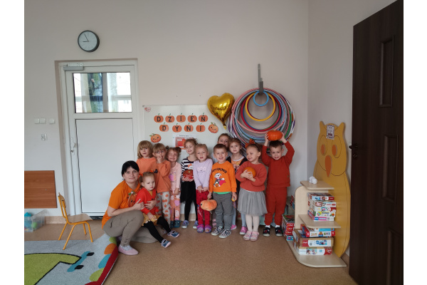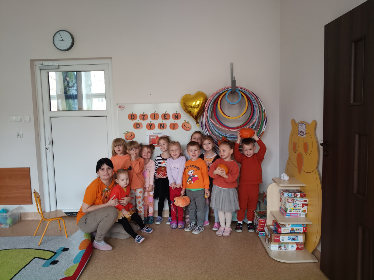 W grupie „Sówki” obchodziliśmy radośnie Święto Dyni. Tego dnia w sali dominował kolor pomarańczowy – dzieci przyszły ubrane w barwy dyni, dzięki czemu zrobiło się ciepło, wesoło i bardzo jesiennie.