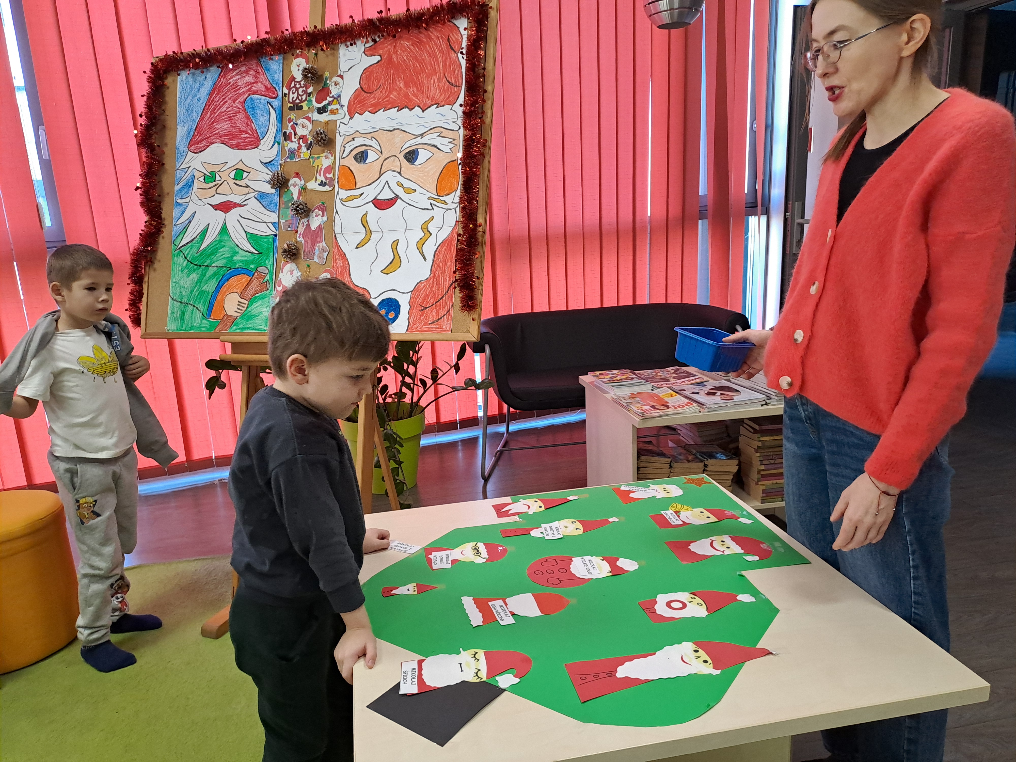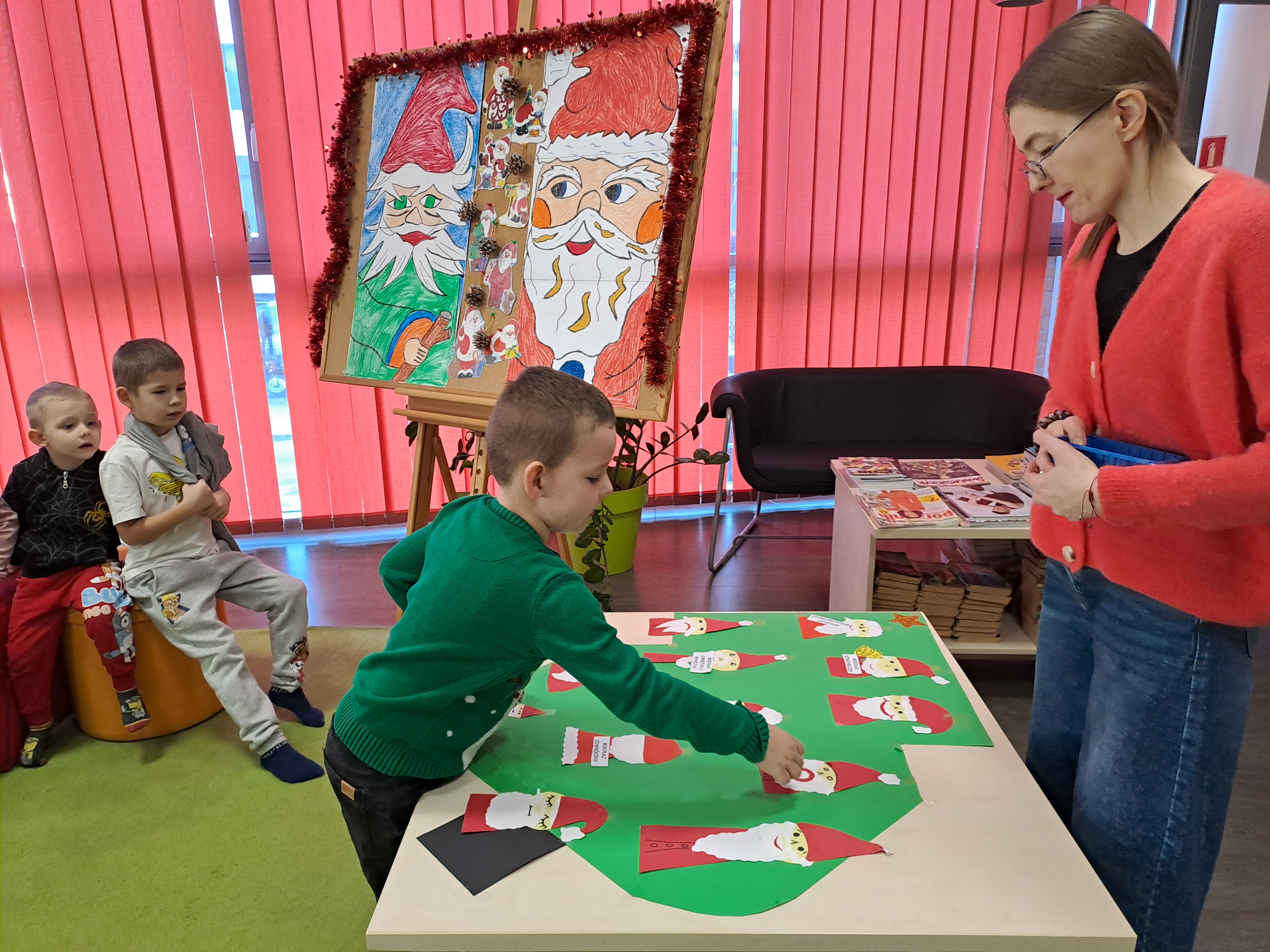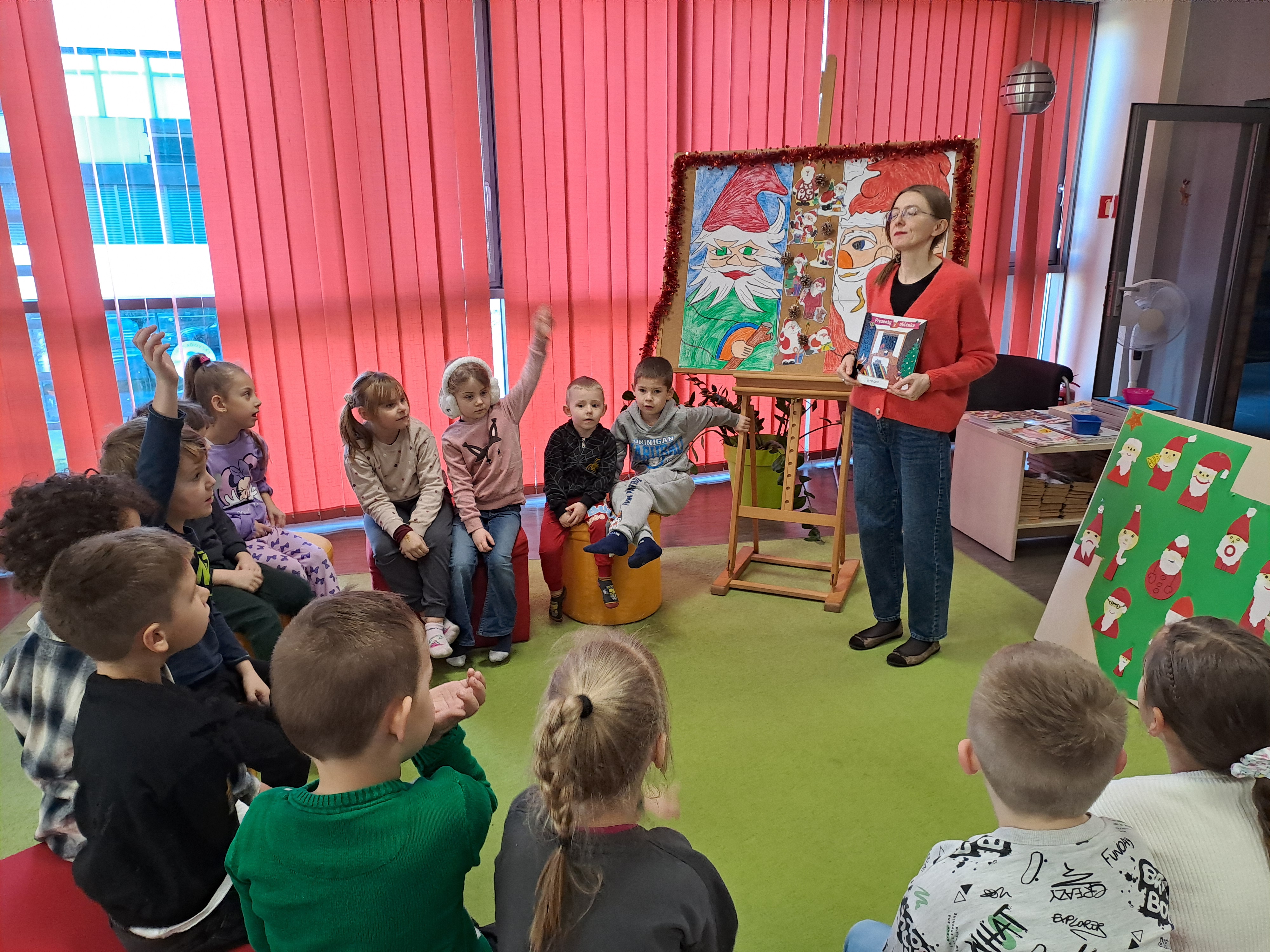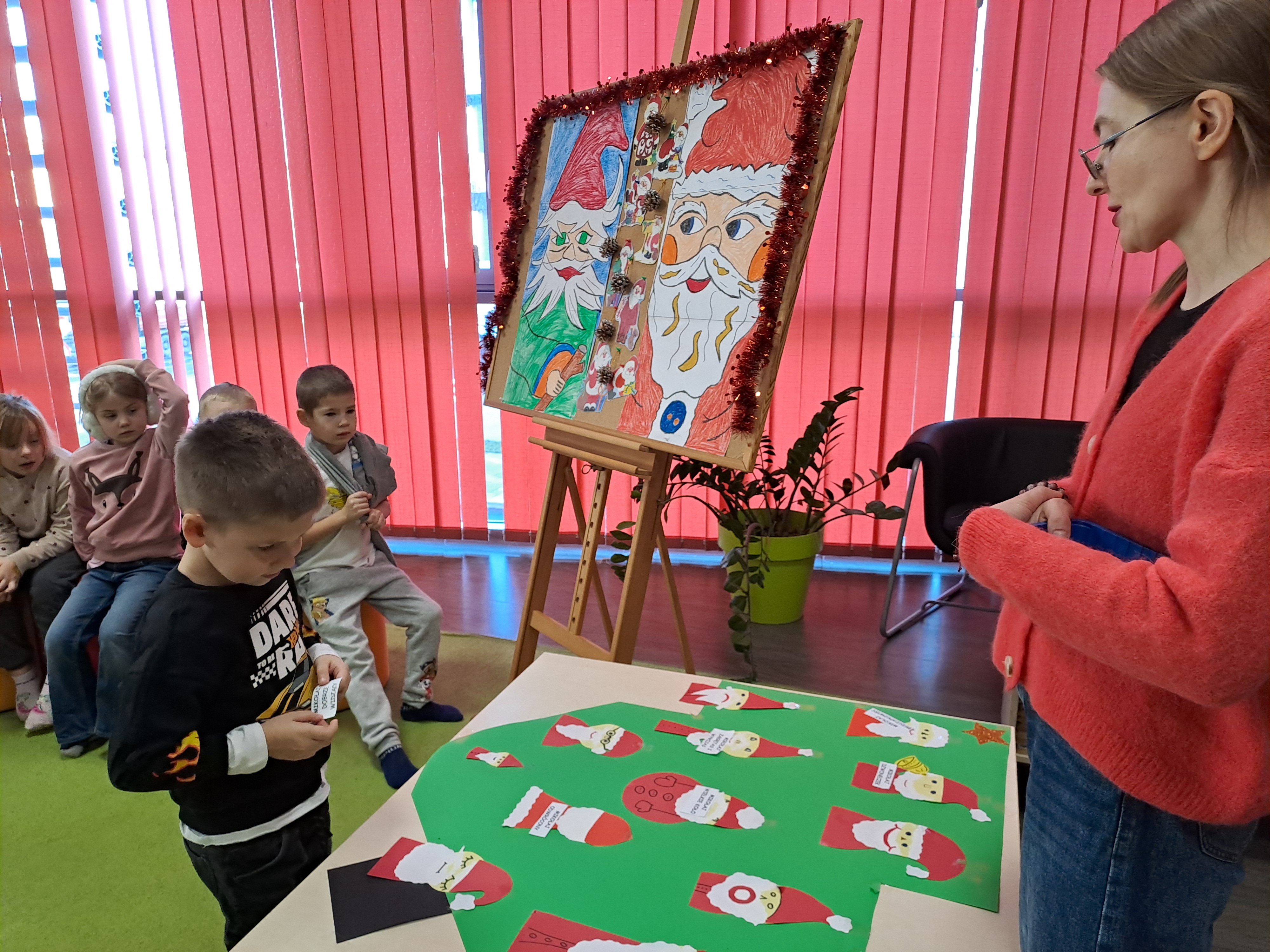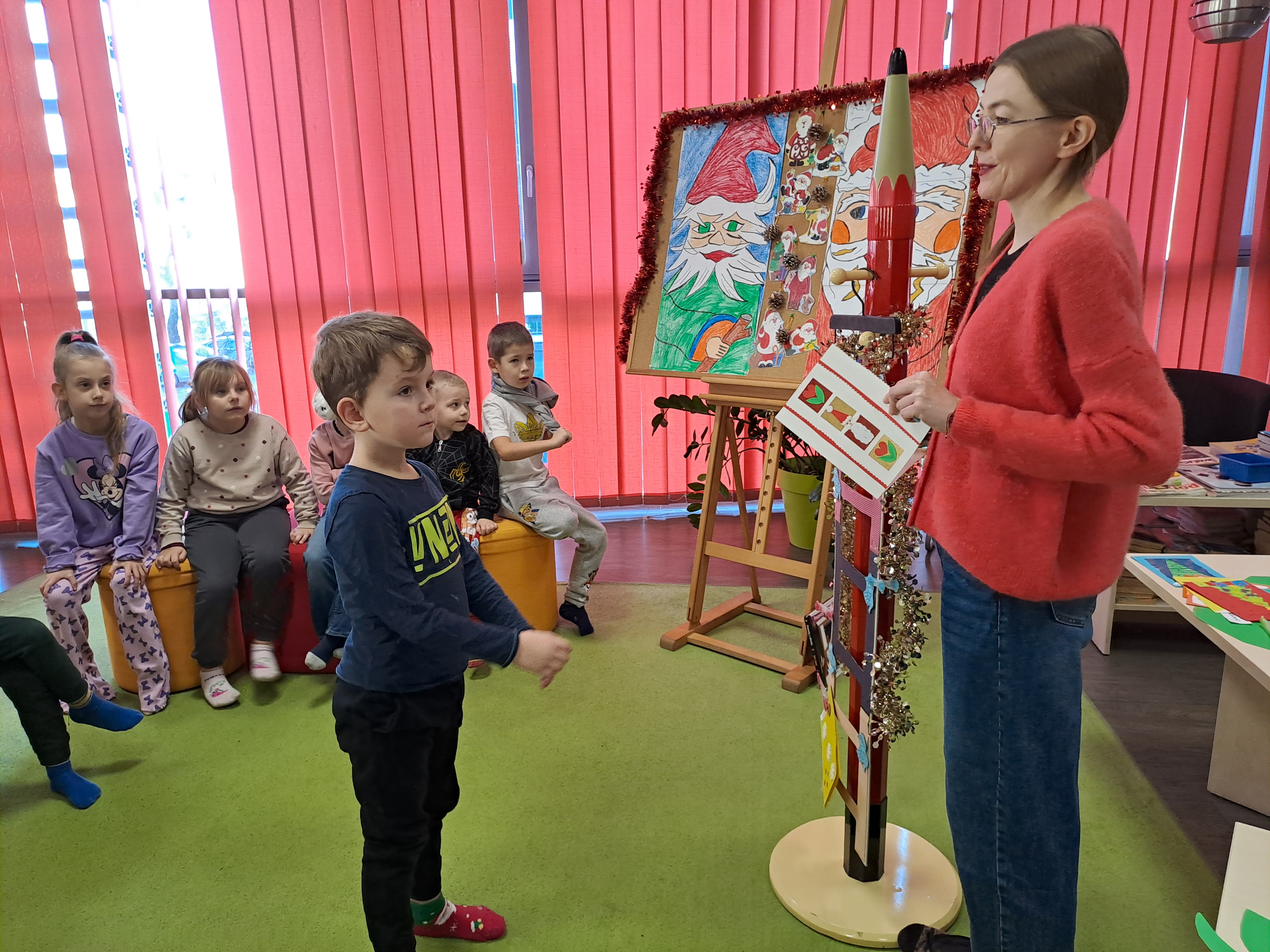 11 grudnia 2025r. odbyło się w bibliotece głośne czytanie, pt.: „Mikołaj Święty myli prezenty". Dzieci bawiły się iluzją kształtów tworząc magię świąt. Wysłuchały książki Taro Gomi, pt.: „Prezenty z okienka”. Razem z Mikołajem starały się rozdać świąteczne niespodzianki. Niestety nie wszystko poszło tak jak było zaplanowane. Dzieci poznały dwunastu Mikołajów, którym zostały nadane imiona oddające ich charaktery. Dzieci odpowiadały na świąteczne pytania, stworzyły również świąteczne choinki, które ozdobiły bombkami i zabawkami. Na zakończenie spotkania skleiły potłuczone bombki. Formą odpoczynku i relaksu po zajęciach było wspólne oglądanie "Zaczarowanego ołowka".