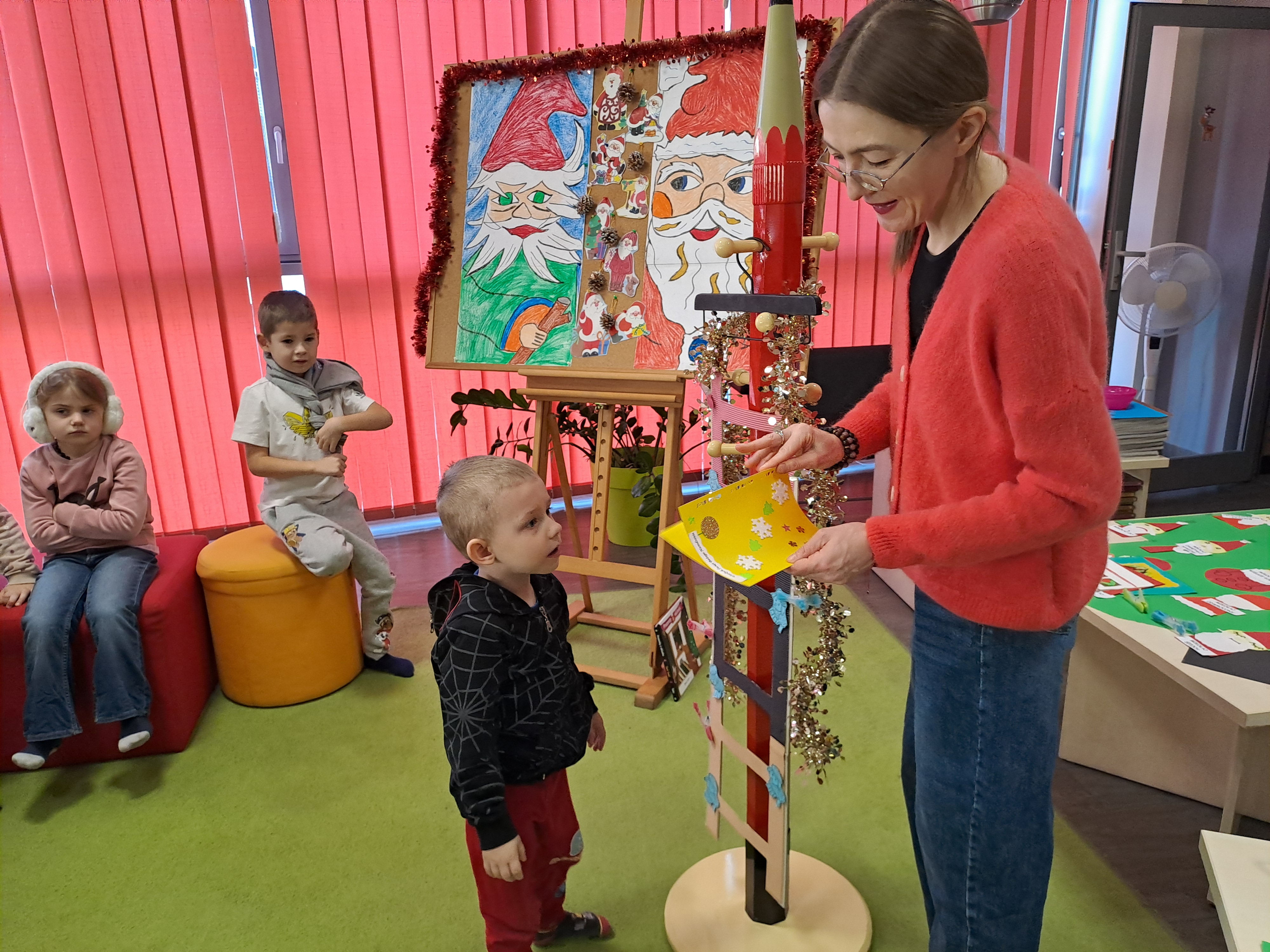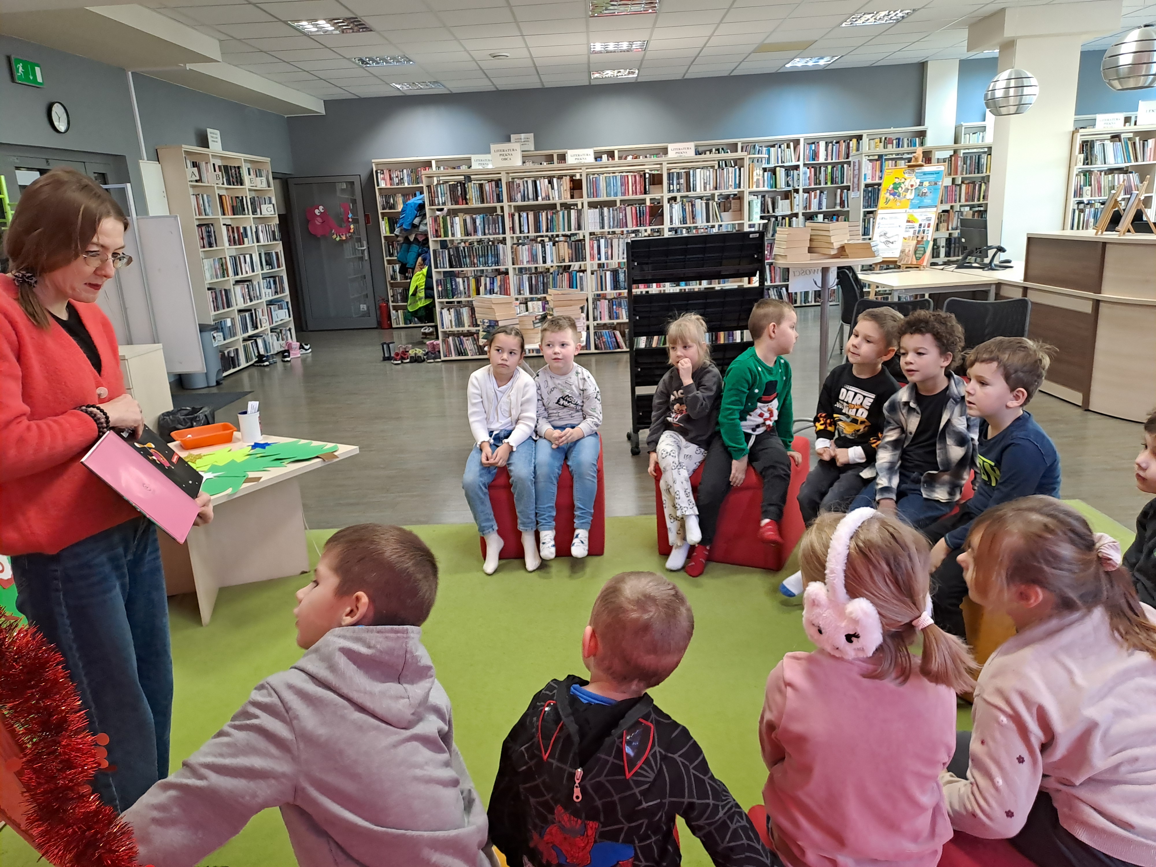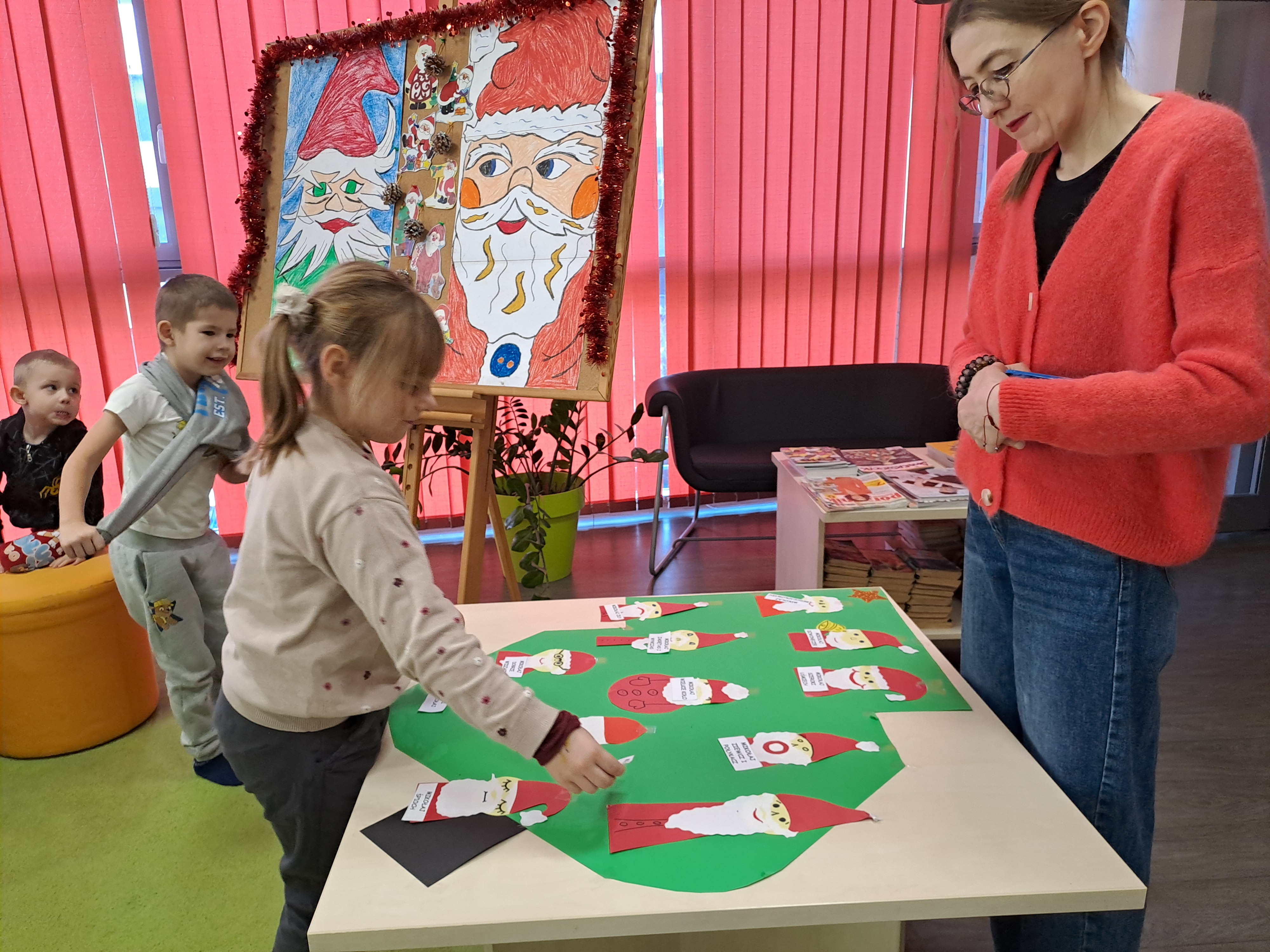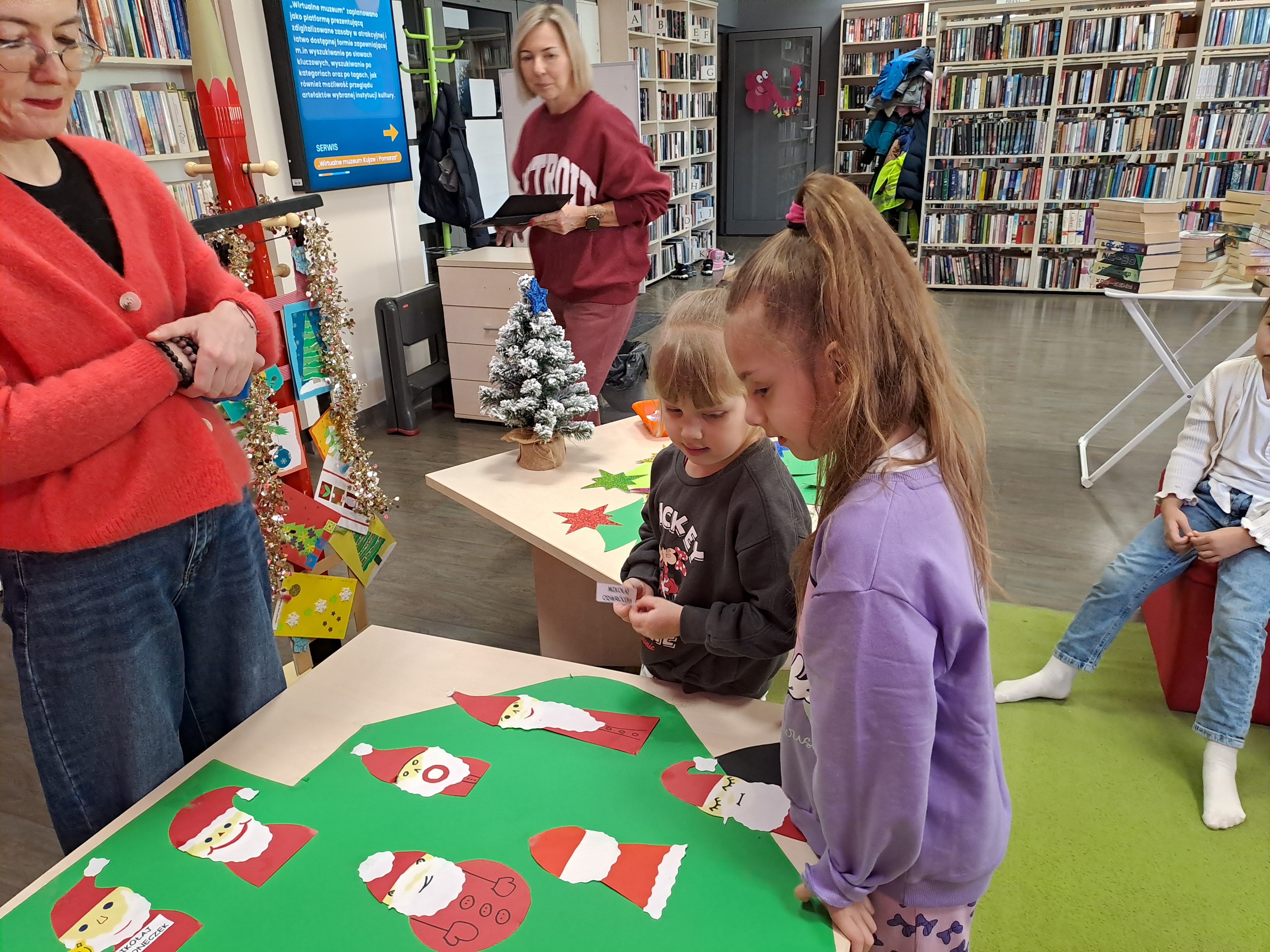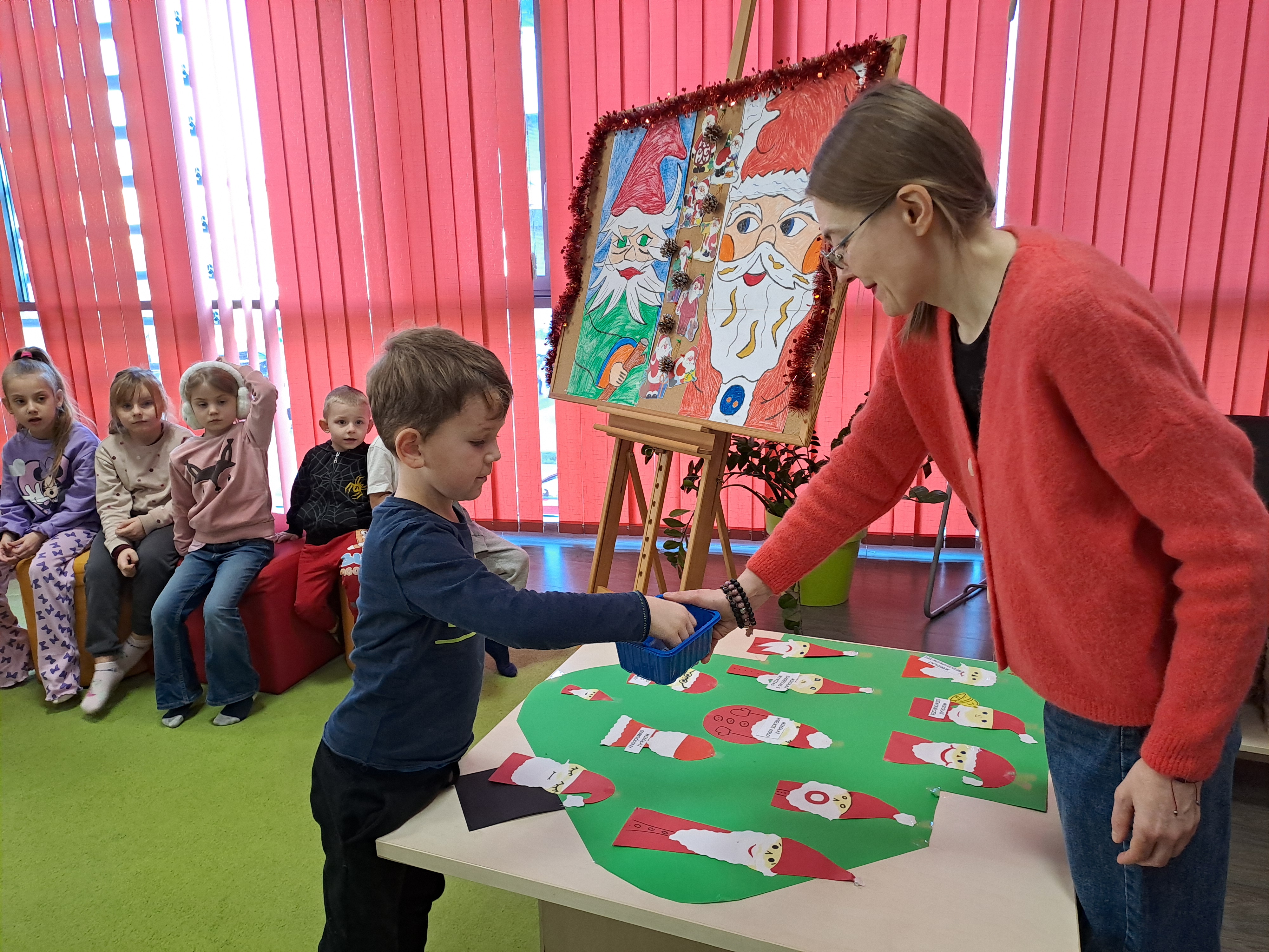 11 grudnia 2025r. odbyło się w bibliotece głośne czytanie, pt.: „Mikołaj Święty myli prezenty". Dzieci bawiły się iluzją kształtów tworząc magię świąt. Wysłuchały książki Taro Gomi, pt.: „Prezenty z okienka”. Razem z Mikołajem starały się rozdać świąteczne niespodzianki. Niestety nie wszystko poszło tak jak było zaplanowane. Dzieci poznały dwunastu Mikołajów, którym zostały nadane imiona oddające ich charaktery. Dzieci odpowiadały na świąteczne pytania, stworzyły również świąteczne choinki, które ozdobiły bombkami i zabawkami. Na zakończenie spotkania skleiły potłuczone bombki. Formą odpoczynku i relaksu po zajęciach było wspólne oglądanie "Zaczarowanego ołowka".