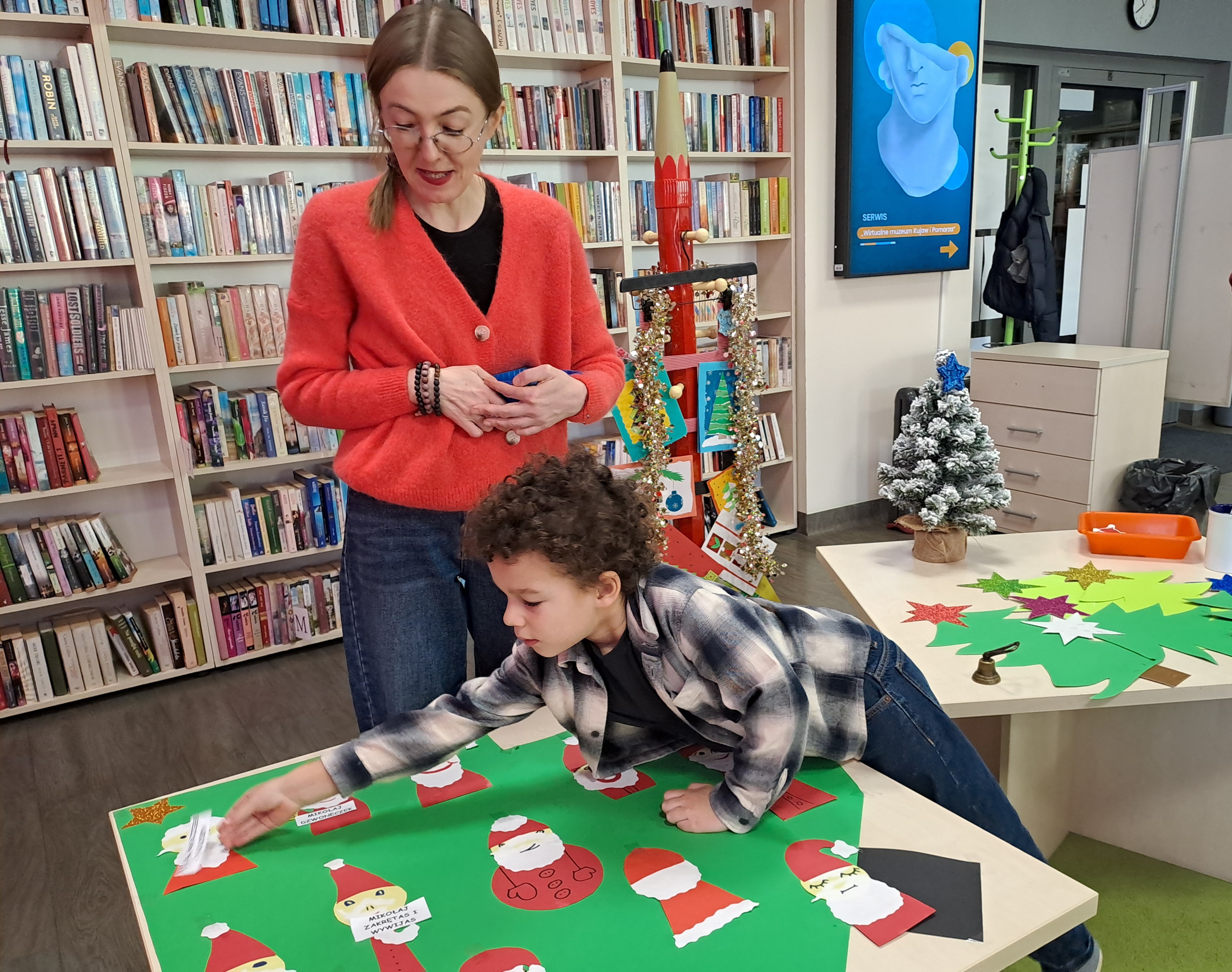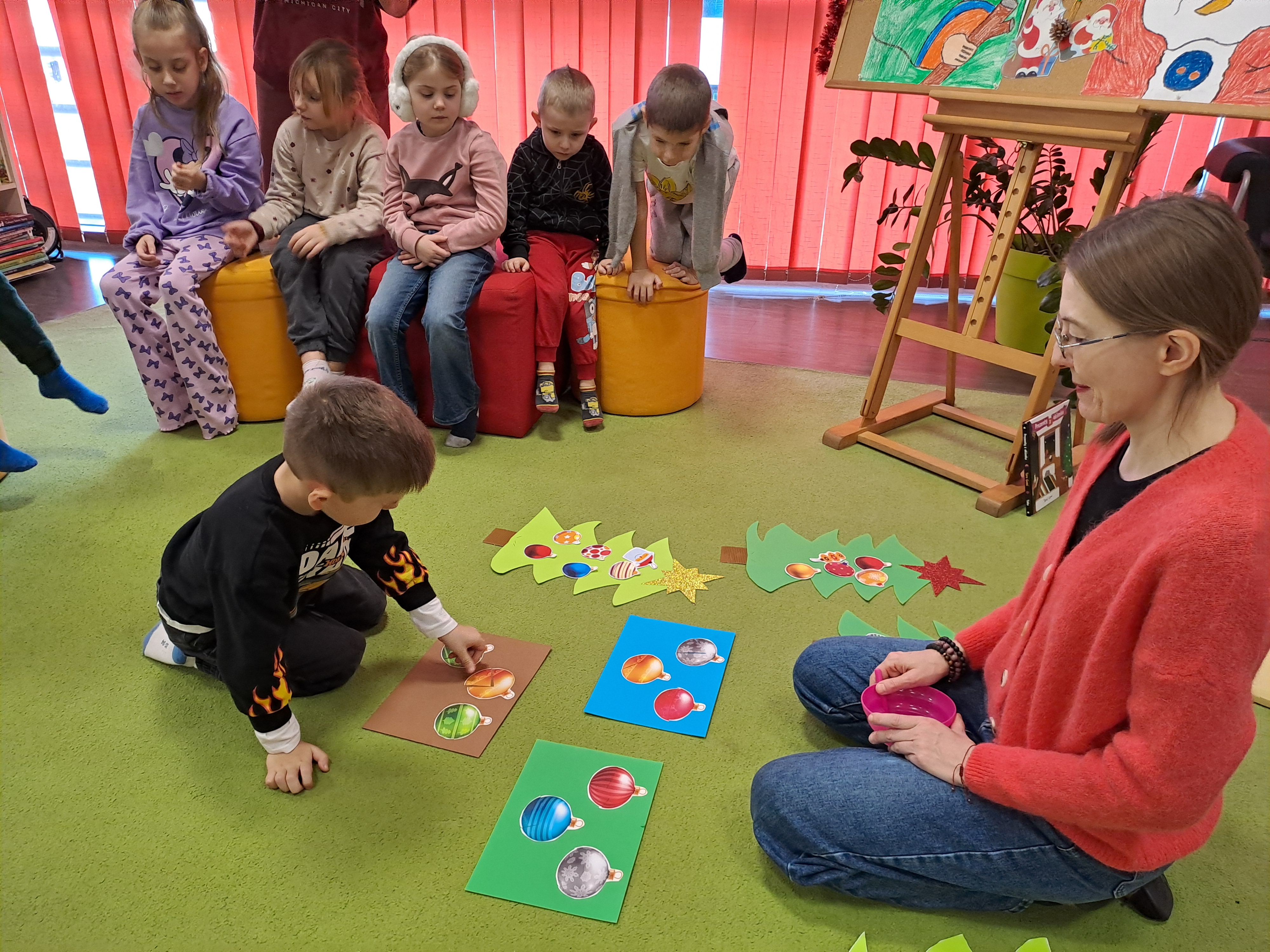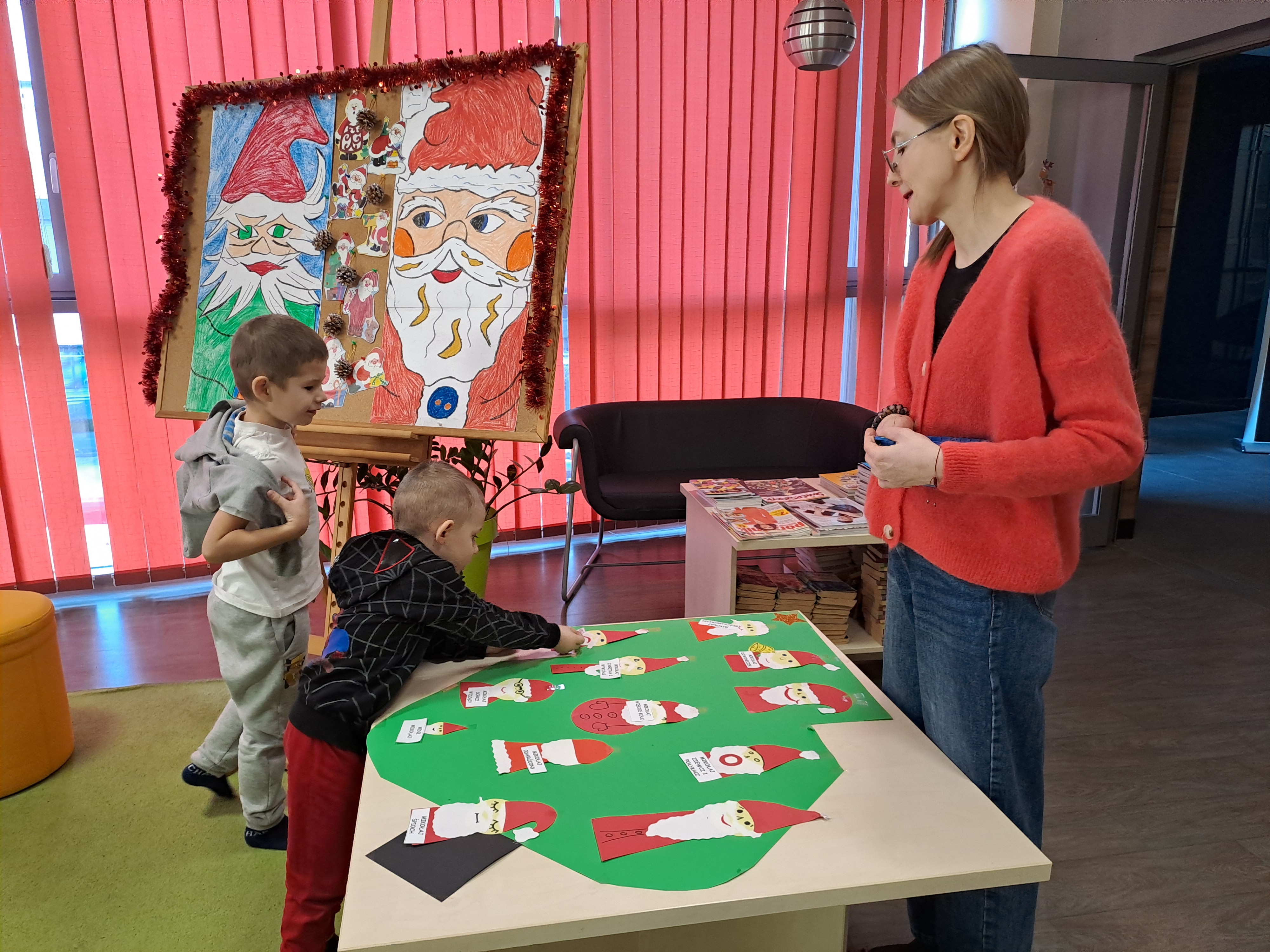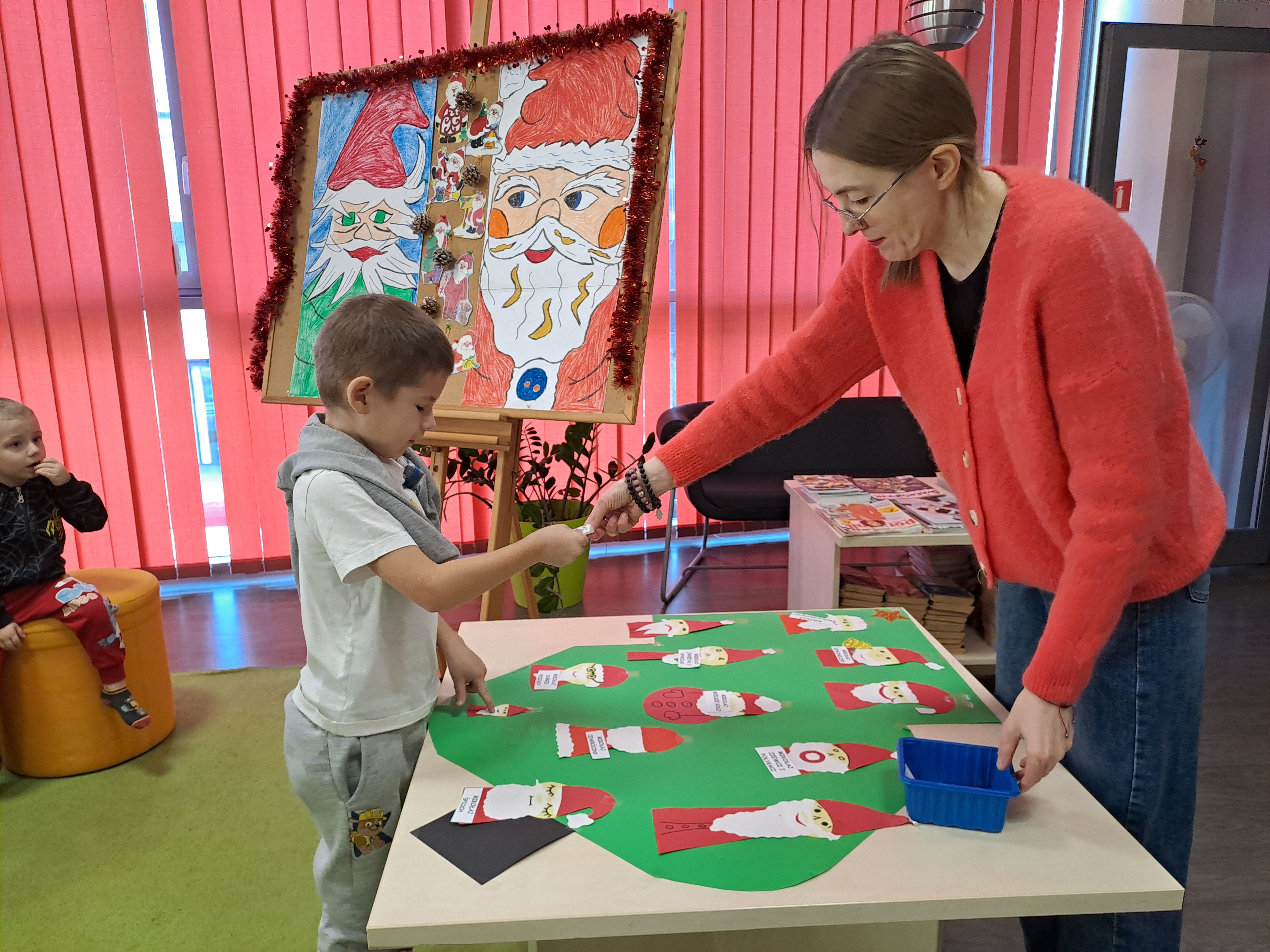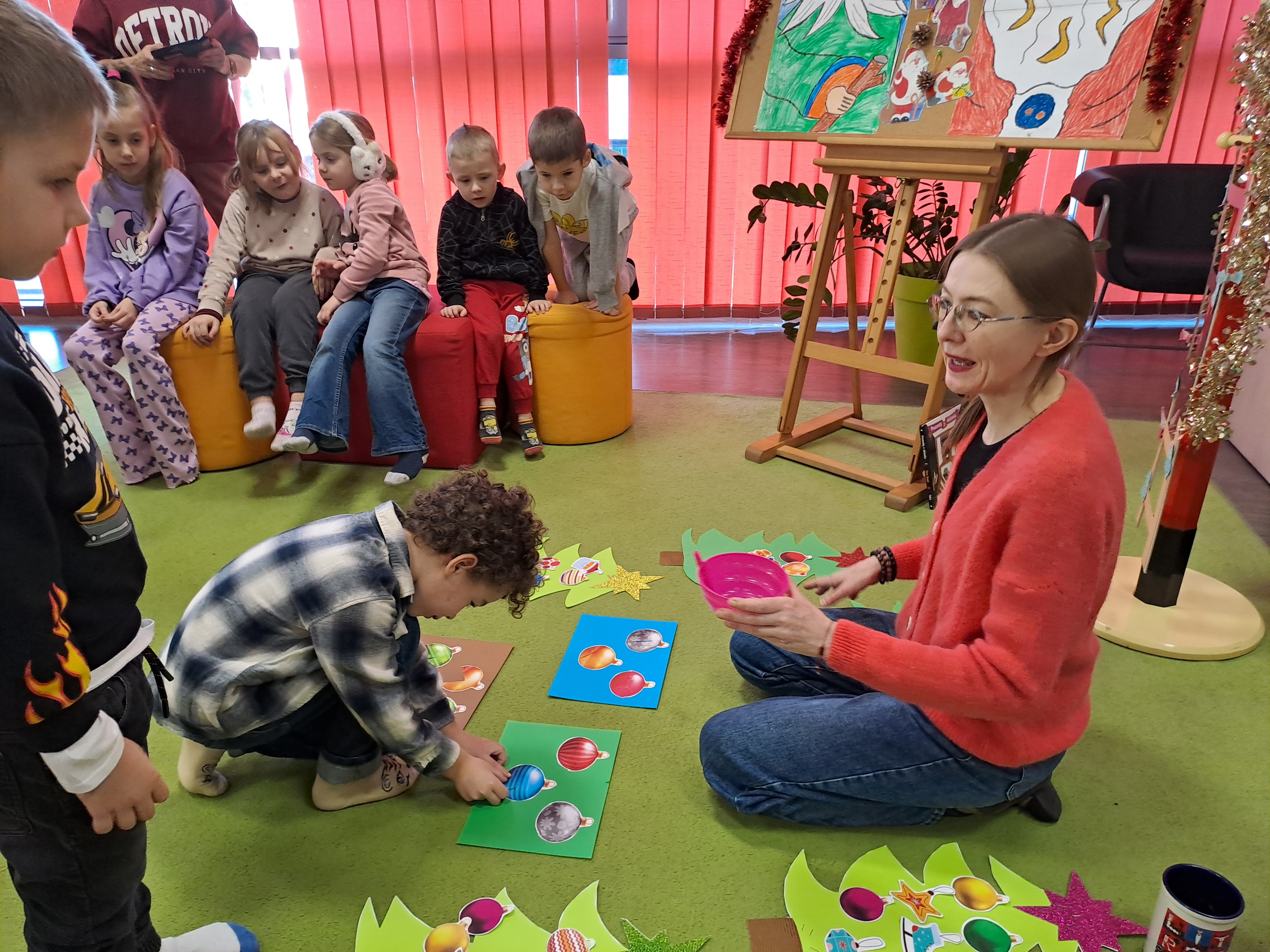 11 grudnia 2025r. odbyło się w bibliotece głośne czytanie, pt.: „Mikołaj Święty myli prezenty". Dzieci bawiły się iluzją kształtów tworząc magię świąt. Wysłuchały książki Taro Gomi, pt.: „Prezenty z okienka”. Razem z Mikołajem starały się rozdać świąteczne niespodzianki. Niestety nie wszystko poszło tak jak było zaplanowane. Dzieci poznały dwunastu Mikołajów, którym zostały nadane imiona oddające ich charaktery. Dzieci odpowiadały na świąteczne pytania, stworzyły również świąteczne choinki, które ozdobiły bombkami i zabawkami. Na zakończenie spotkania skleiły potłuczone bombki. Formą odpoczynku i relaksu po zajęciach było wspólne oglądanie "Zaczarowanego ołowka".