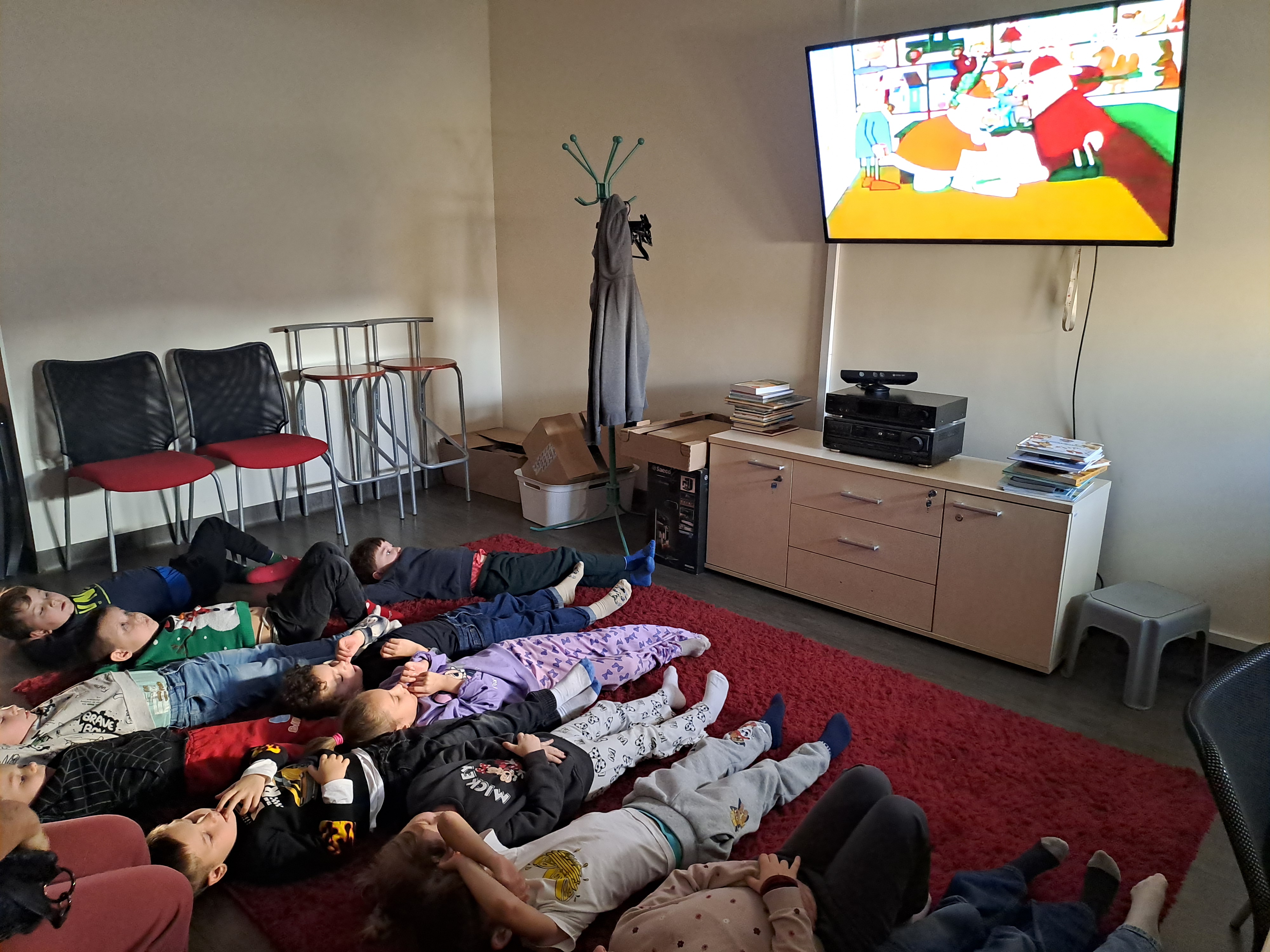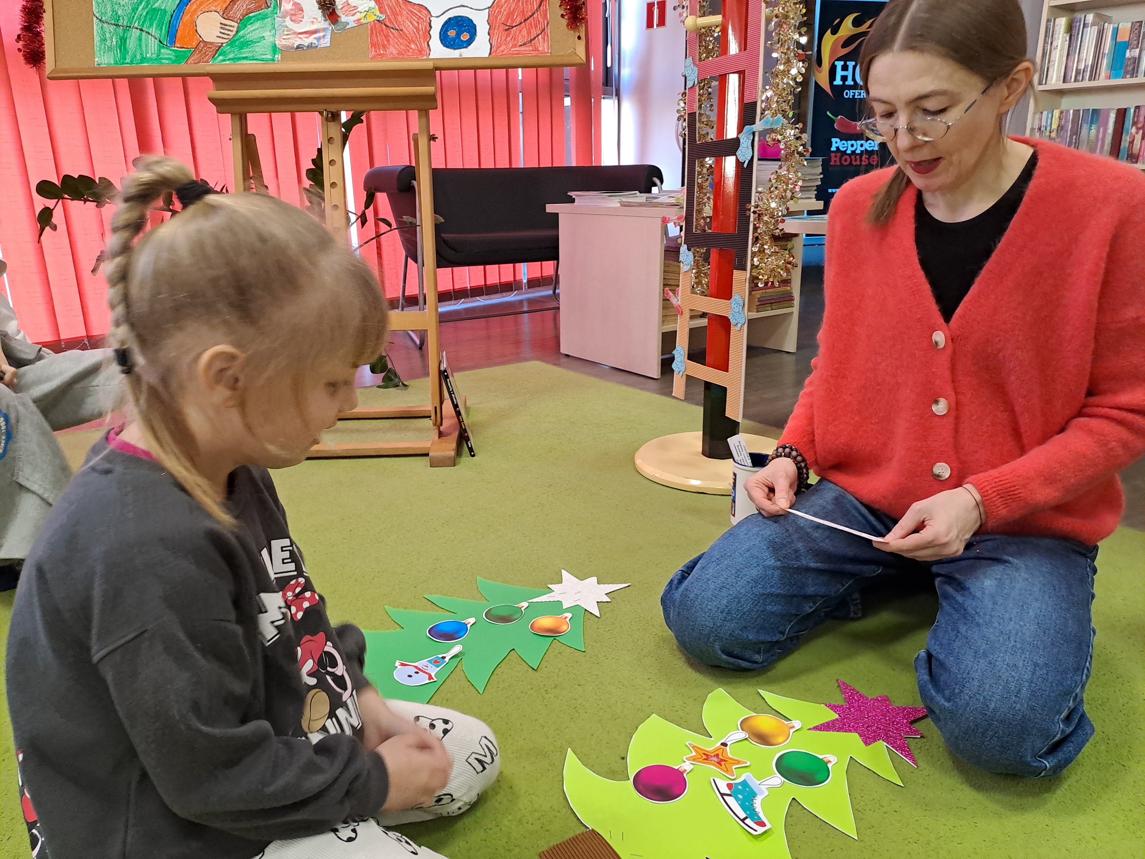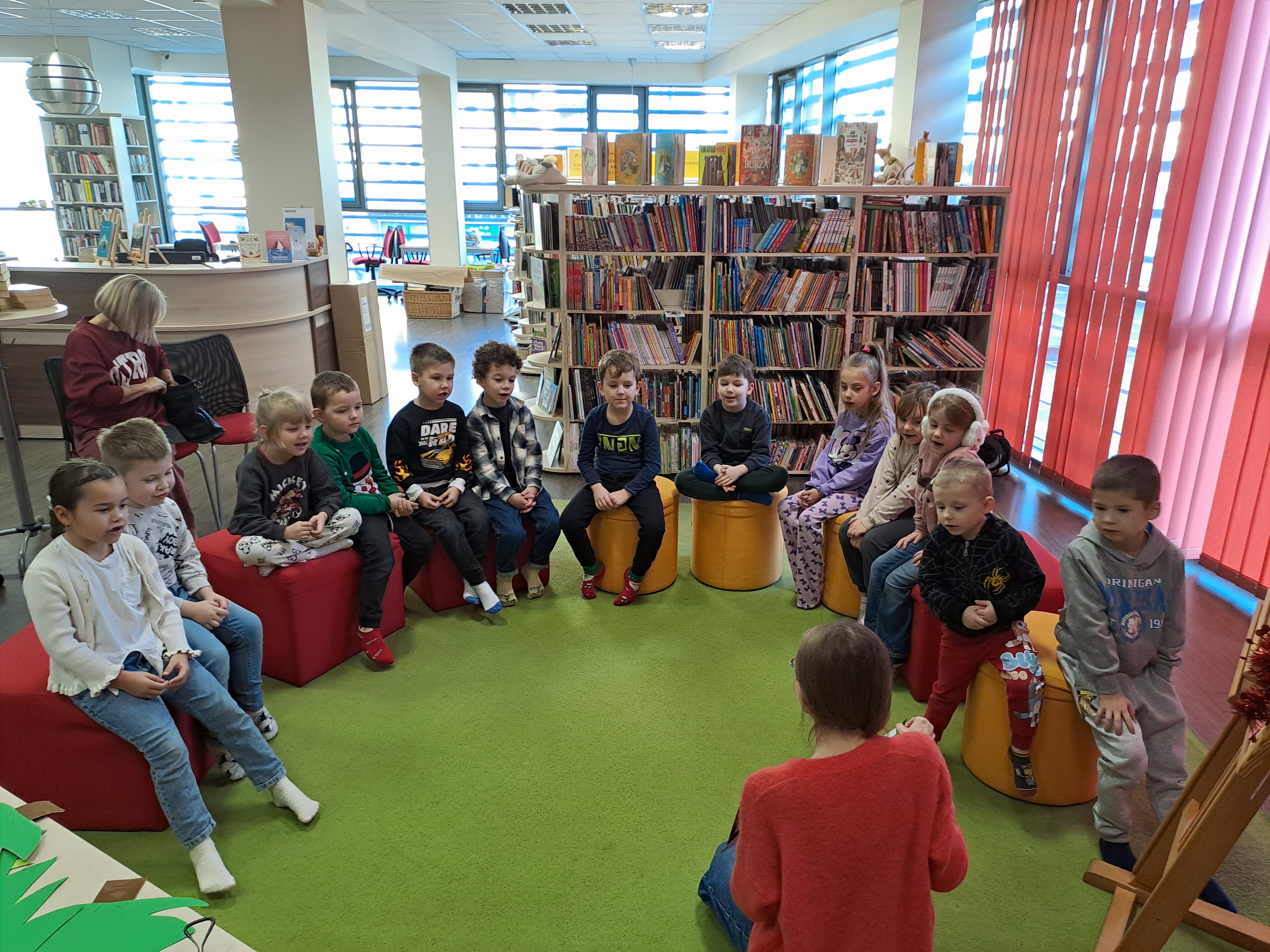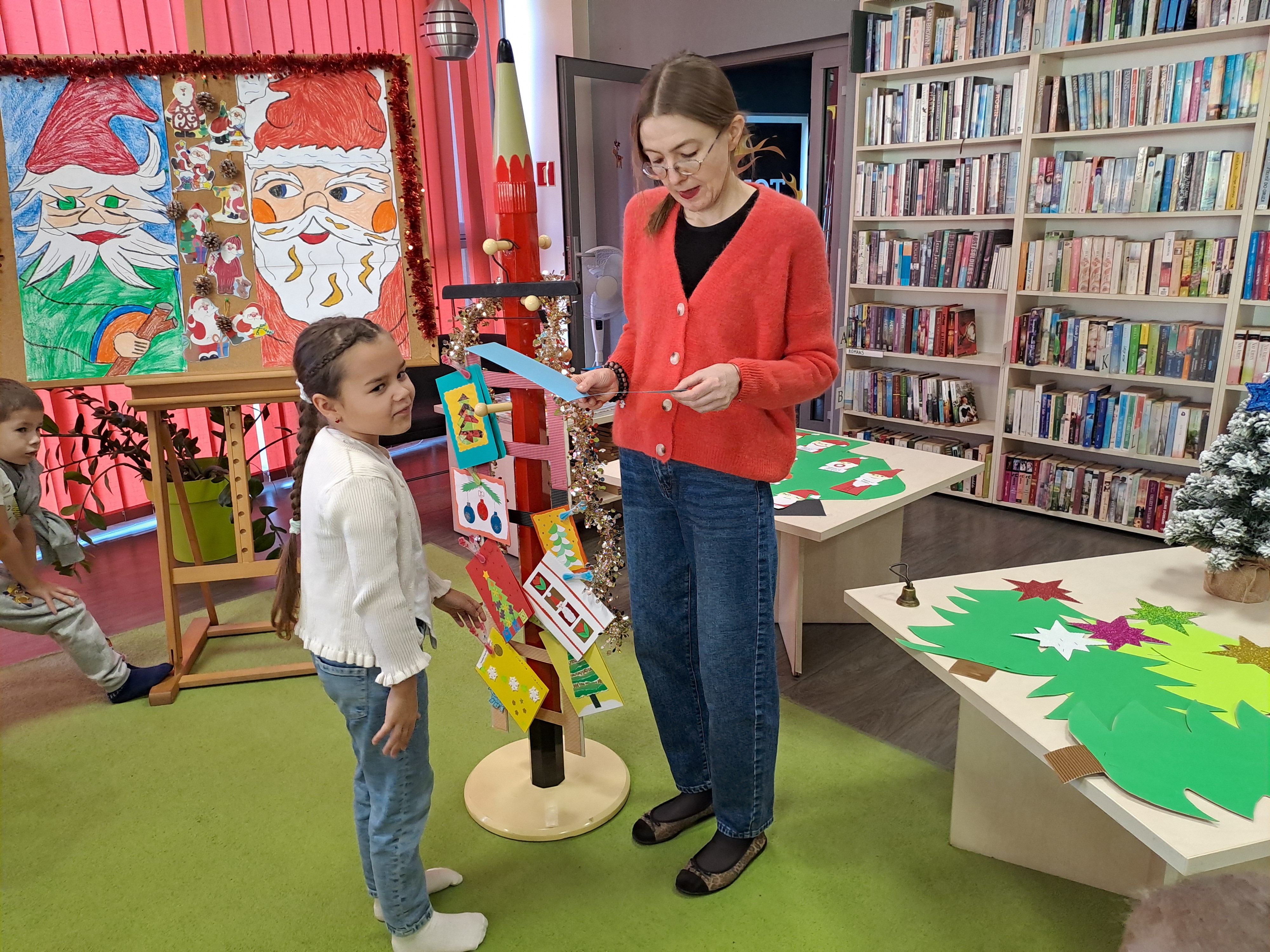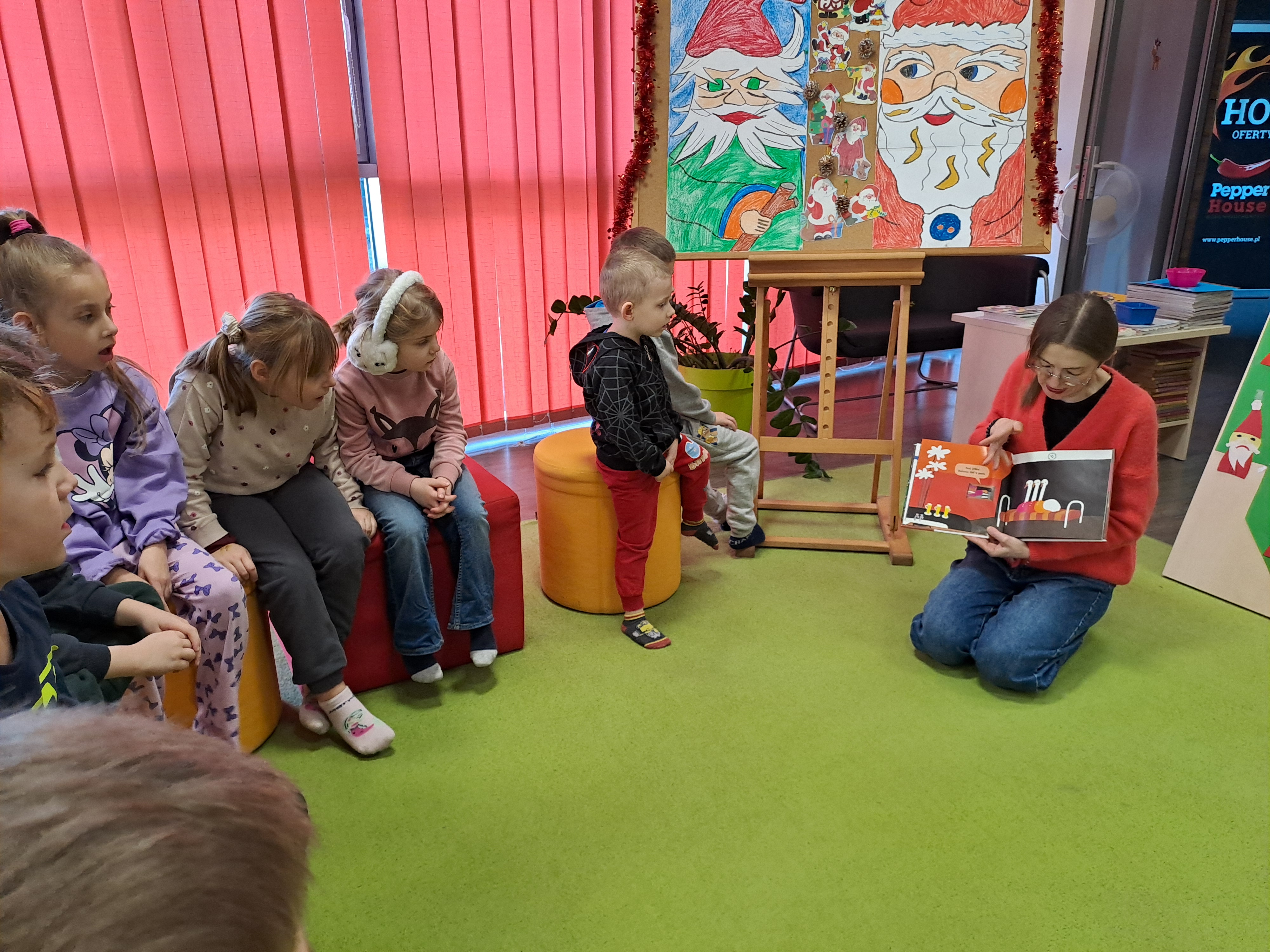 11 grudnia 2025r. odbyło się w bibliotece głośne czytanie, pt.: „Mikołaj Święty myli prezenty". Dzieci bawiły się iluzją kształtów tworząc magię świąt. Wysłuchały książki Taro Gomi, pt.: „Prezenty z okienka”. Razem z Mikołajem starały się rozdać świąteczne niespodzianki. Niestety nie wszystko poszło tak jak było zaplanowane. Dzieci poznały dwunastu Mikołajów, którym zostały nadane imiona oddające ich charaktery. Dzieci odpowiadały na świąteczne pytania, stworzyły również świąteczne choinki, które ozdobiły bombkami i zabawkami. Na zakończenie spotkania skleiły potłuczone bombki. Formą odpoczynku i relaksu po zajęciach było wspólne oglądanie "Zaczarowanego ołowka".
