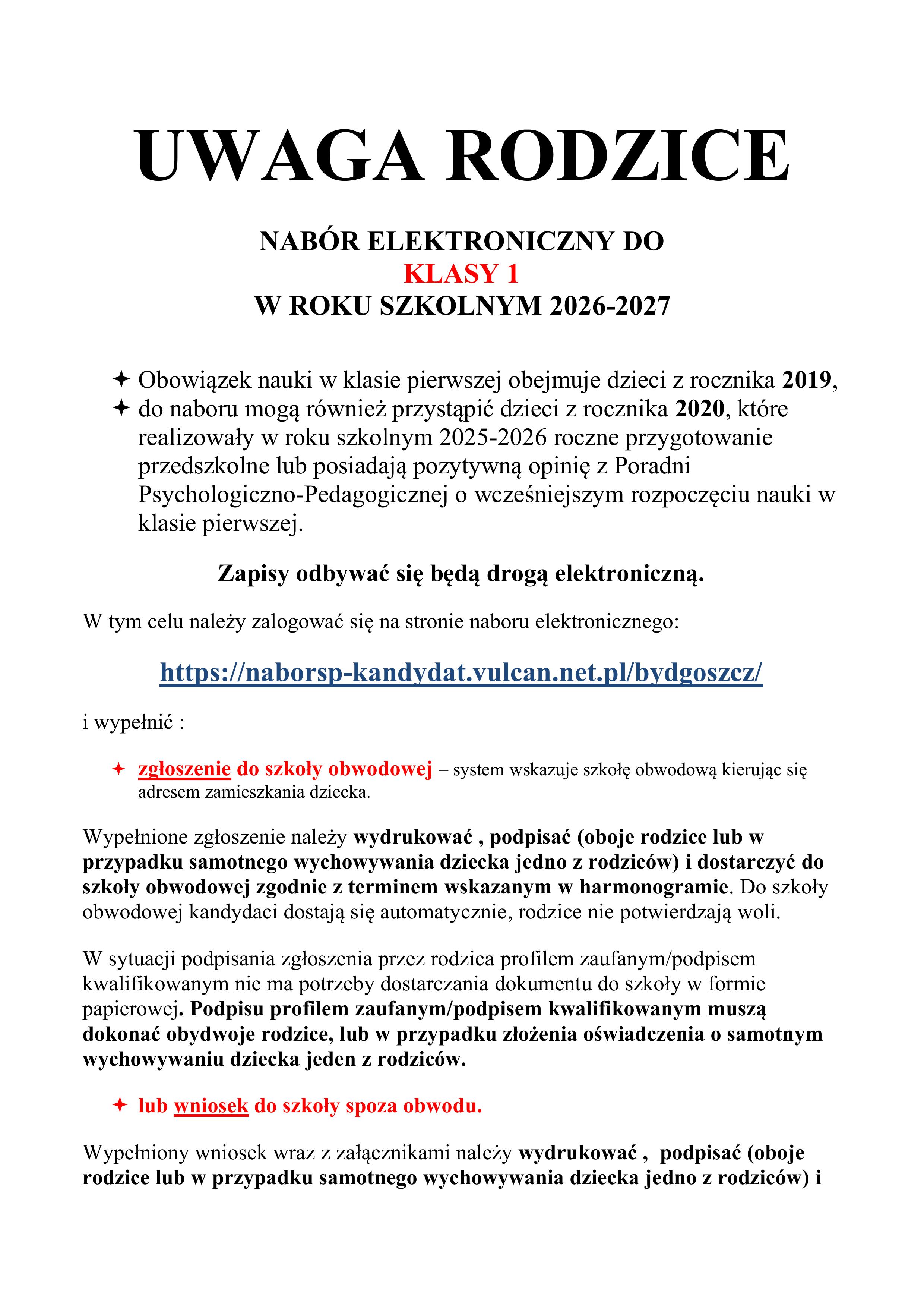 NABÓR ELEKTRONICZNY DO KLASY 1 W ROKU SZKOLNYM 2026-2027