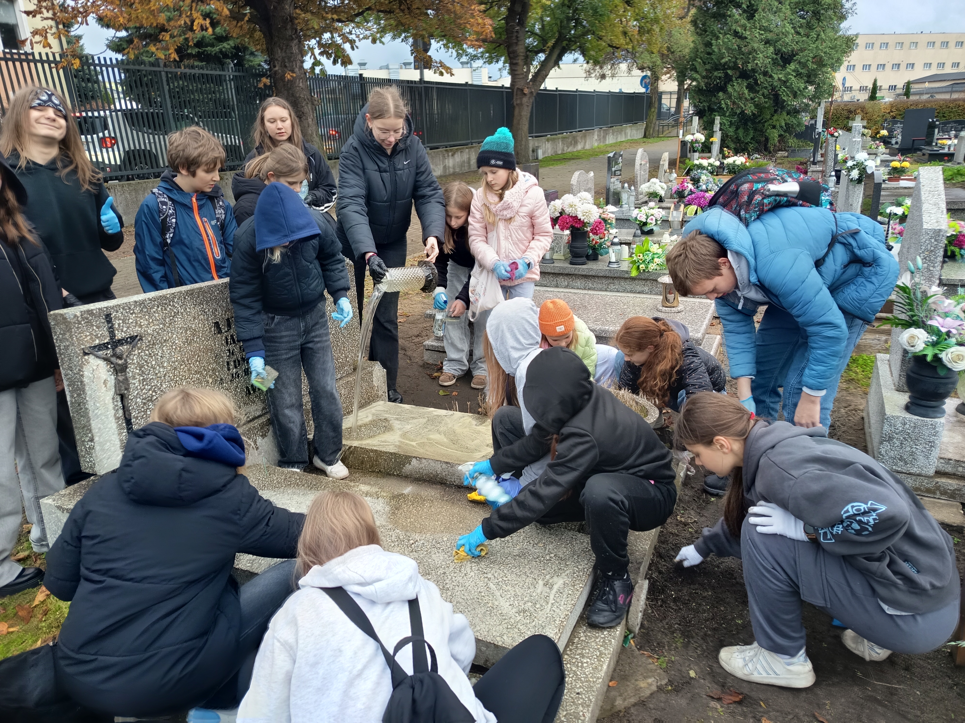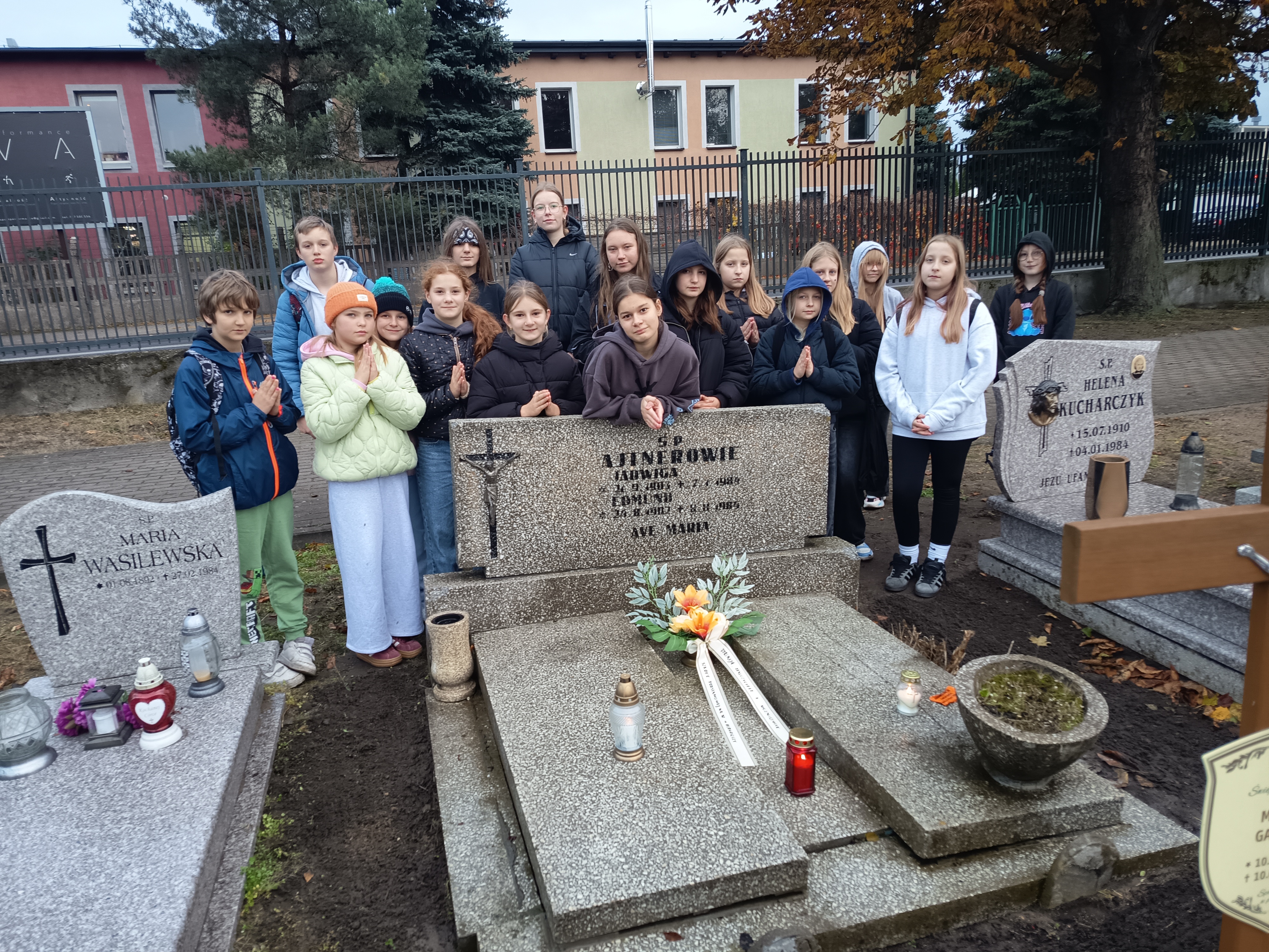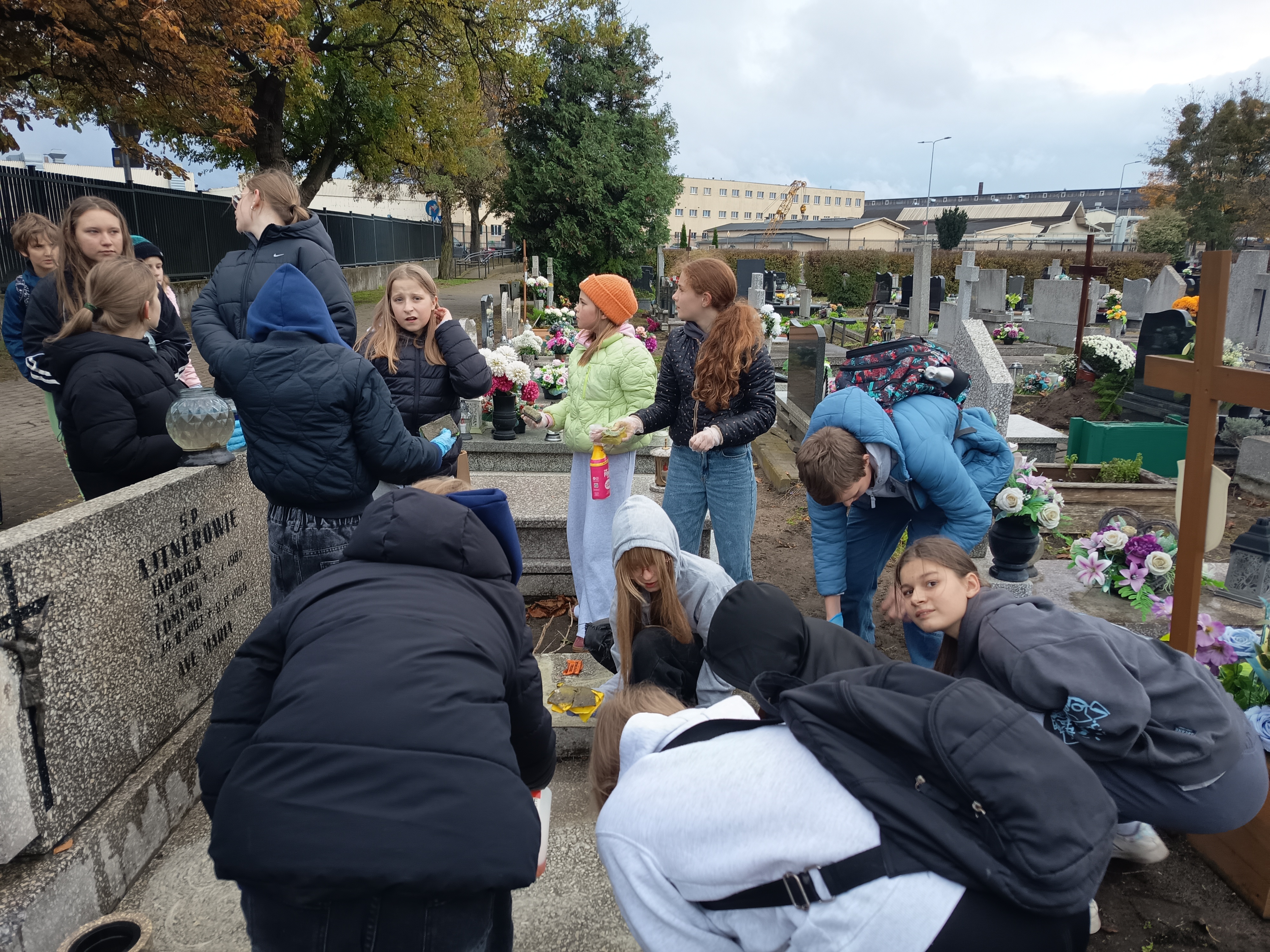 Zbliża się jedno z największych świąt - Uroczystość Wszystkich Świętych. Każdy w tym szczególnym dniu roku pamięta o Tych, którzy odeszli. Dlatego jak co roku wolontariusze udali się na cmentarz, aby posprzątać grób byłego Dyrektora naszej szkoły. Zanieśli piękną wiązankę kwiatów, zapalili znicze i modlili się za wszystkich zmarłych: "Niech odpoczywają w pokoju..."