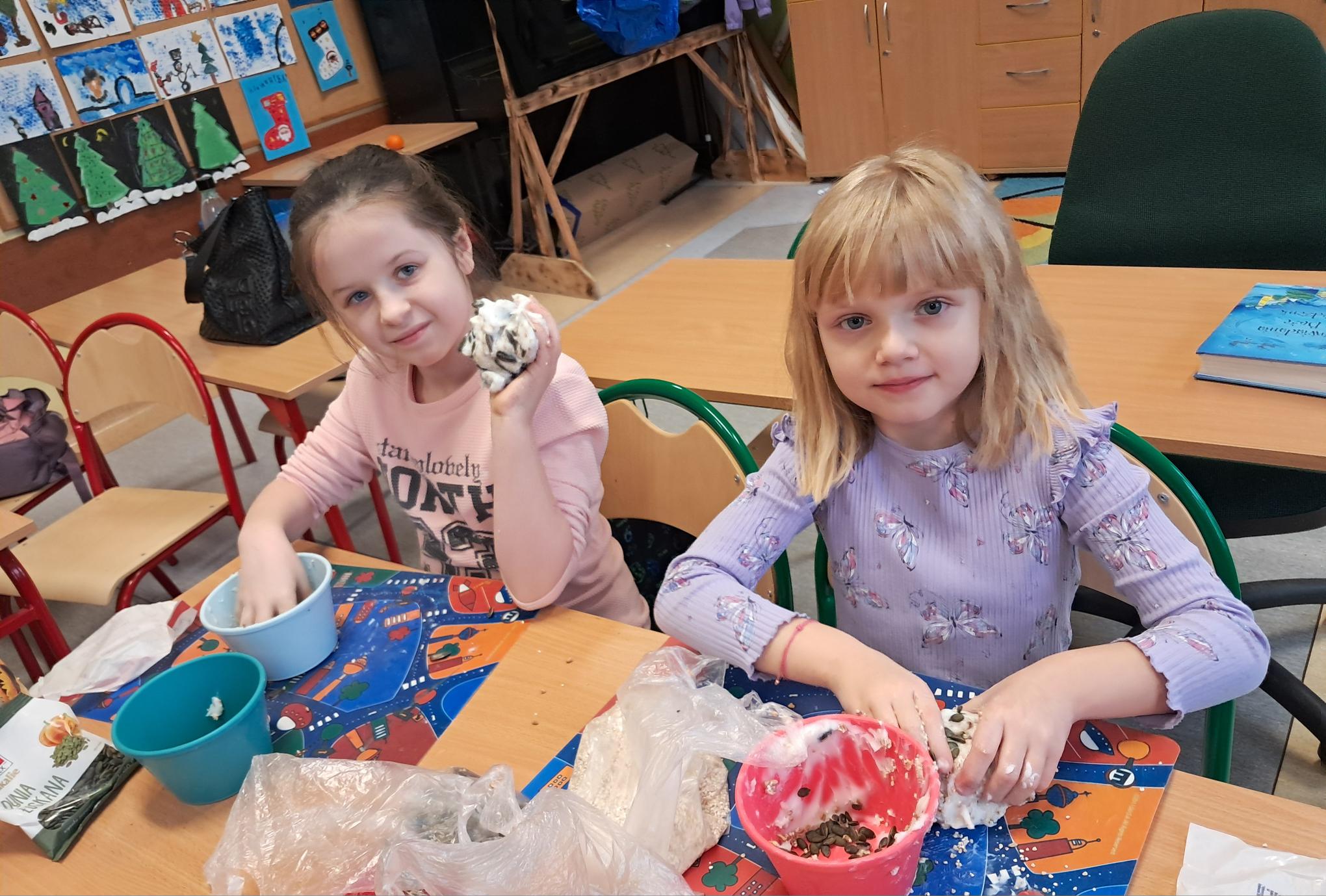 W ostatni piątek postanowiliśmy pobawić się sensoryczne a przy okazji nakarmić ptaki. Kule ze smalcu dla niektórych dzieci klasy 1C spowodowały nietęgie miny ale sprawiły wiele radości.