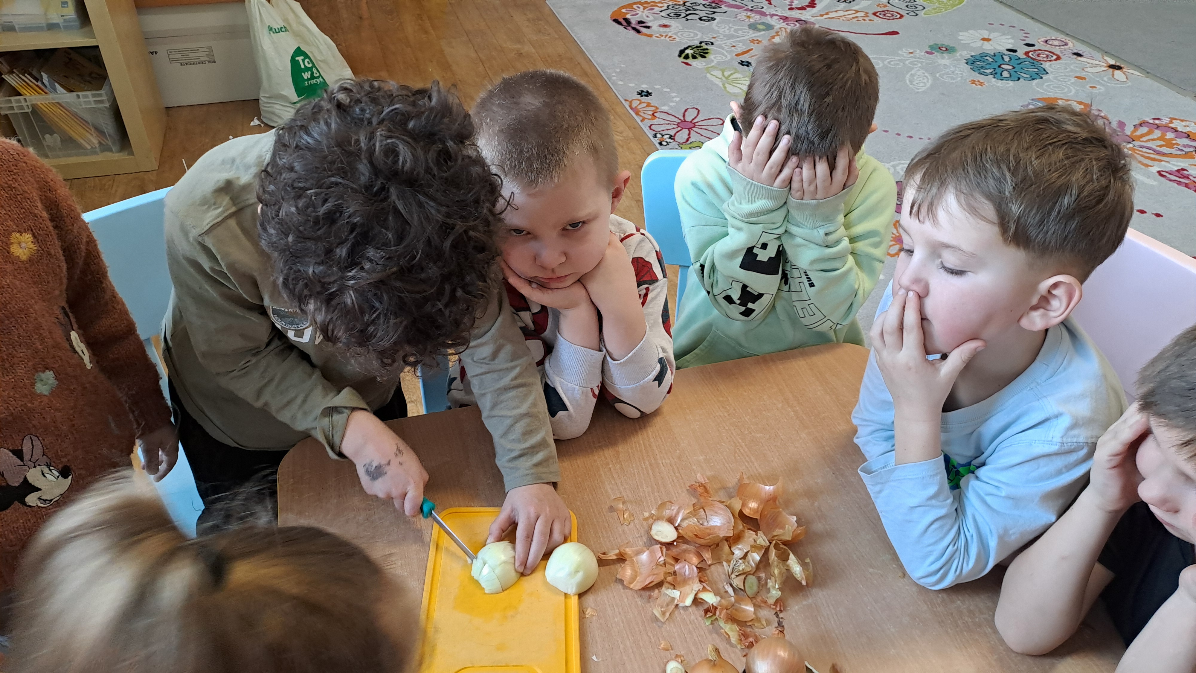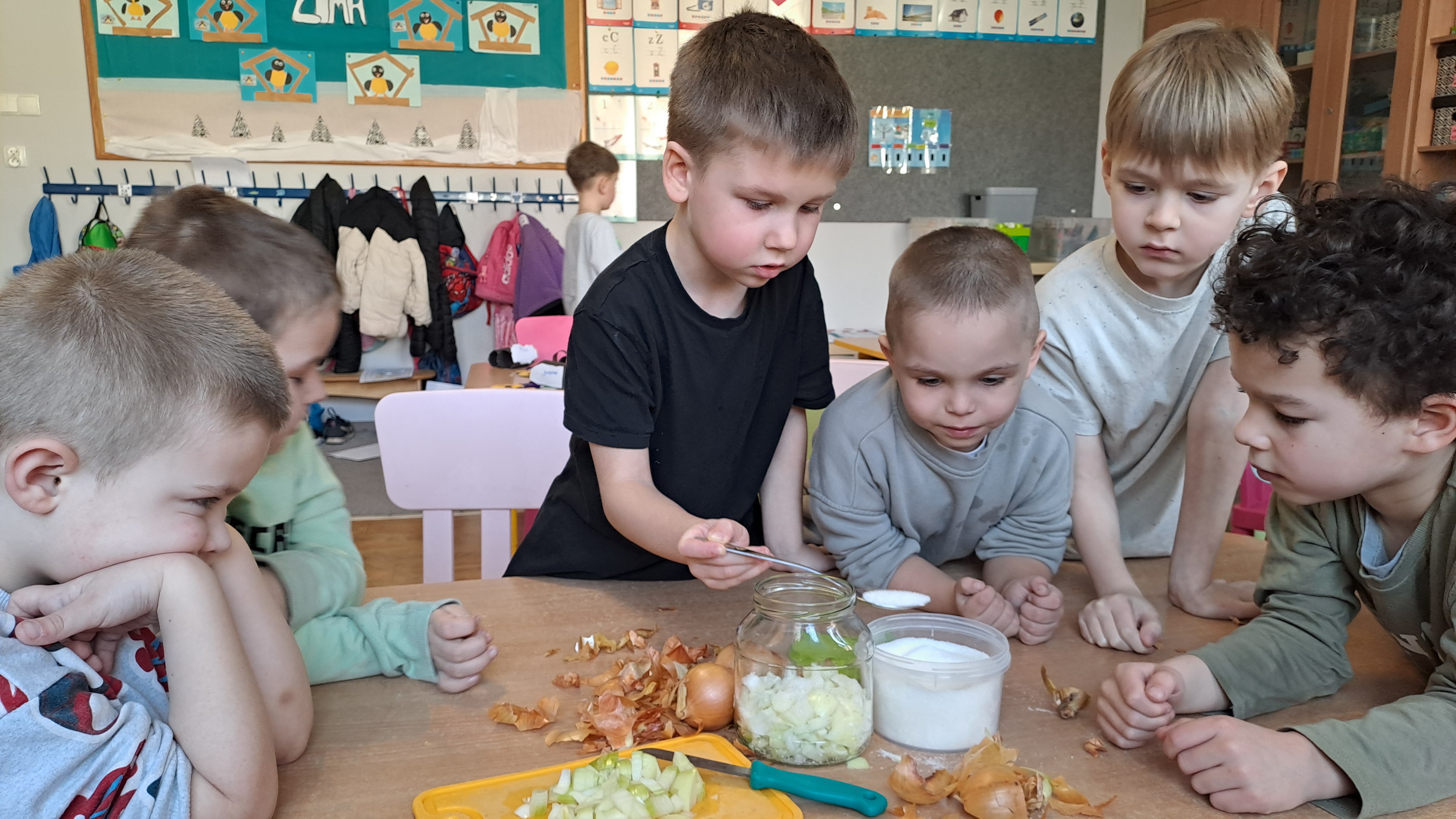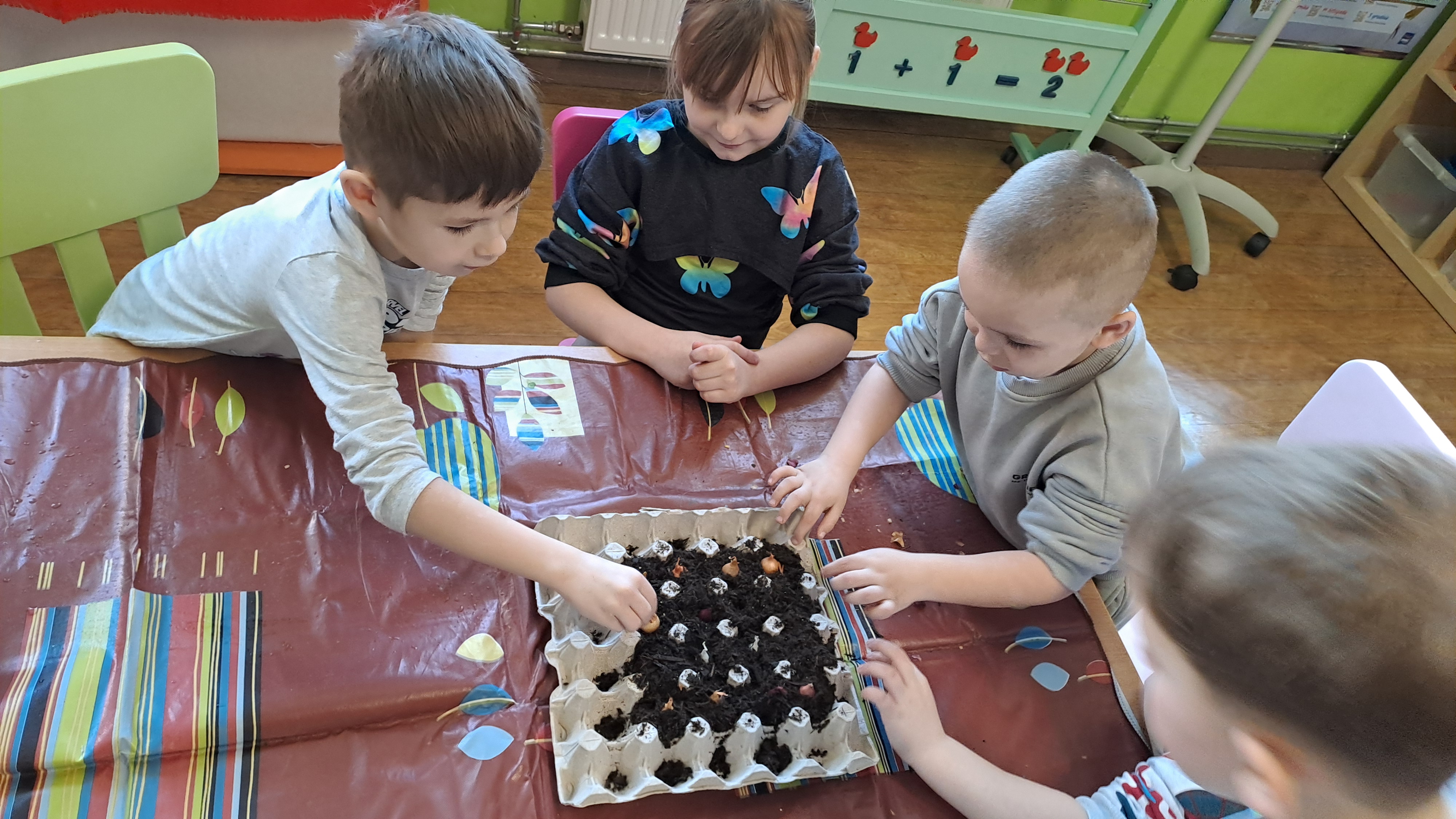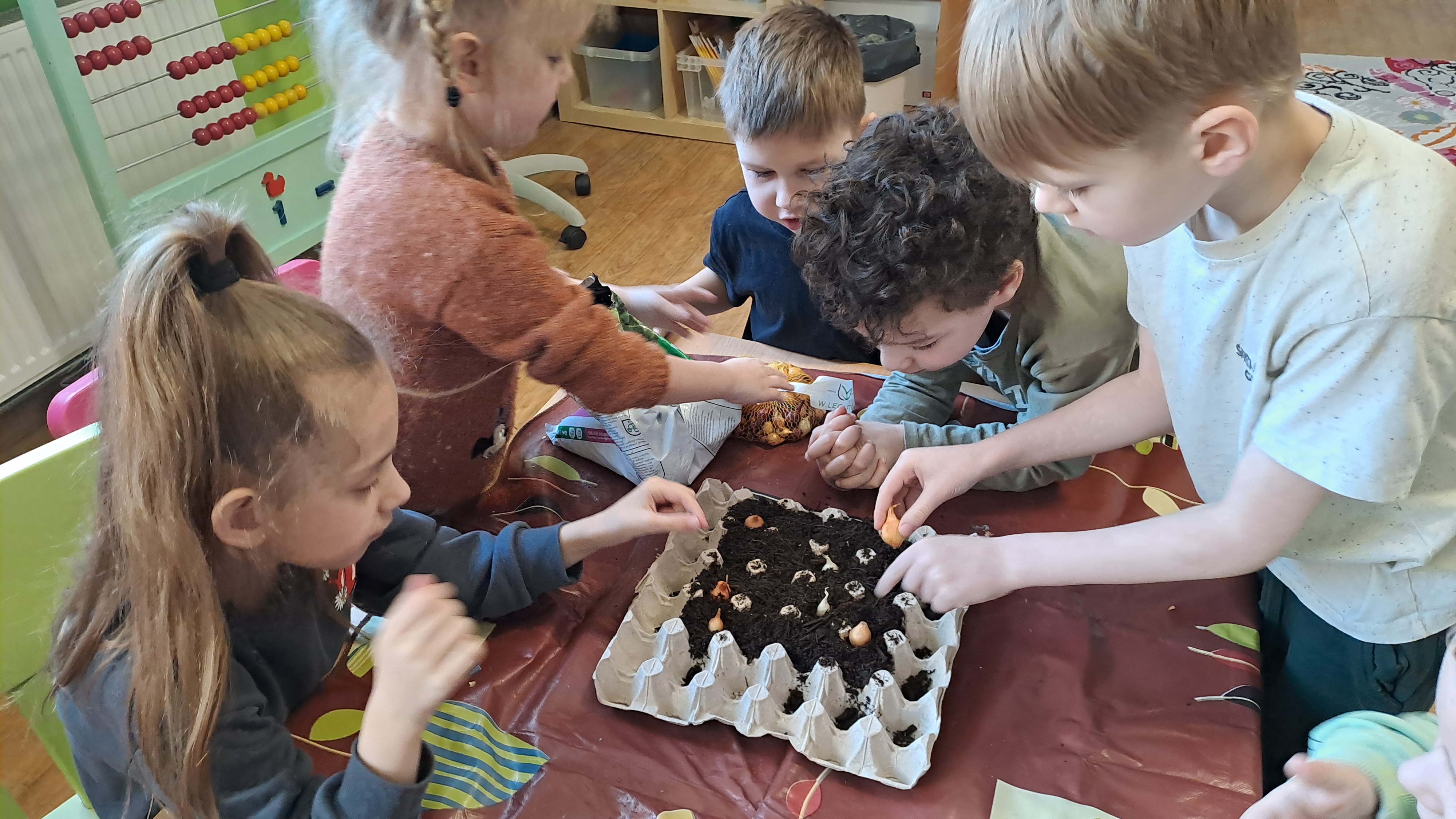 Na początku małe cebulki sadzimy, potem podlewamy i za szczypiokiem cierpliwie czekamy. On rośnie, a my go zjadamy.
