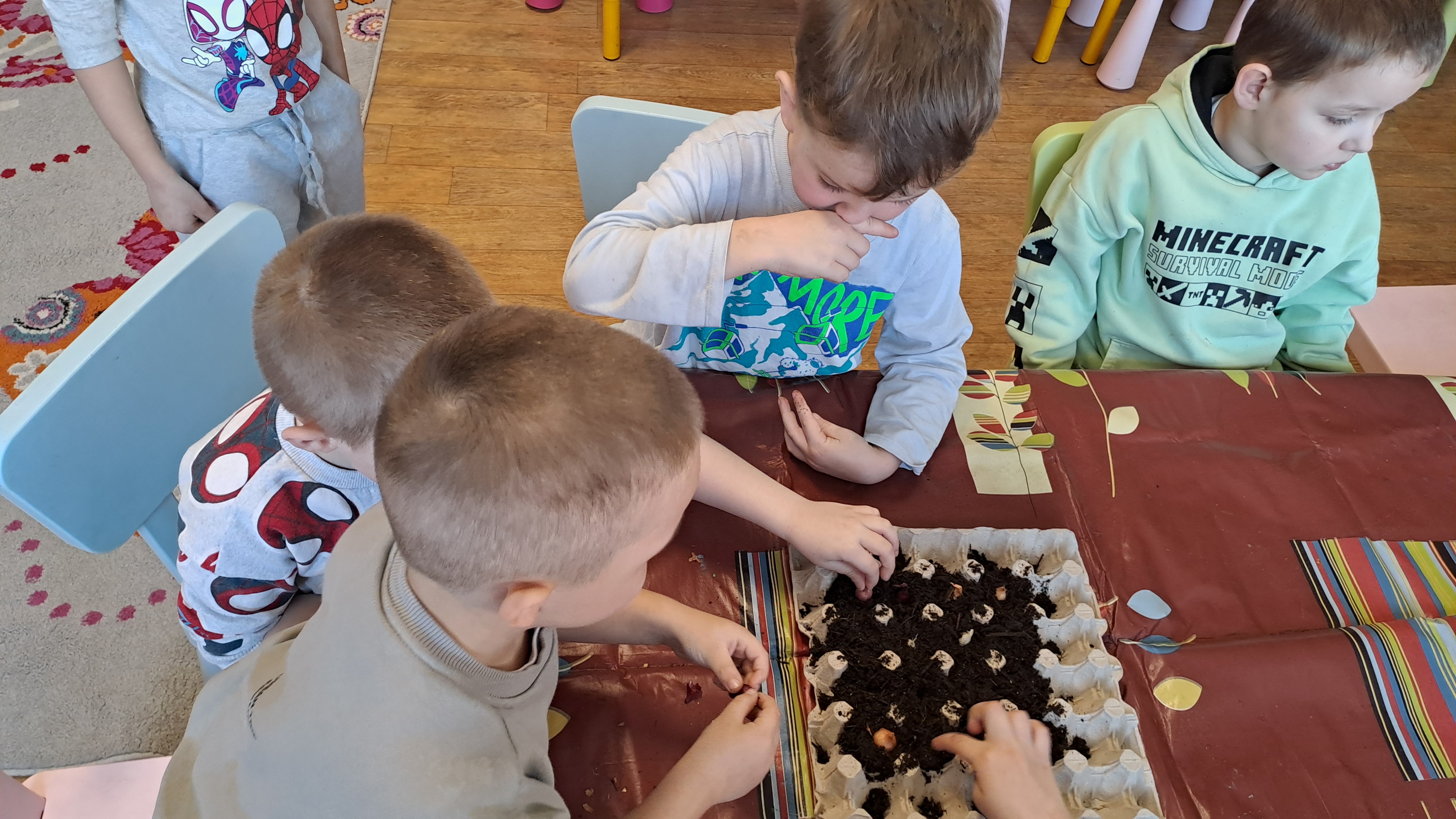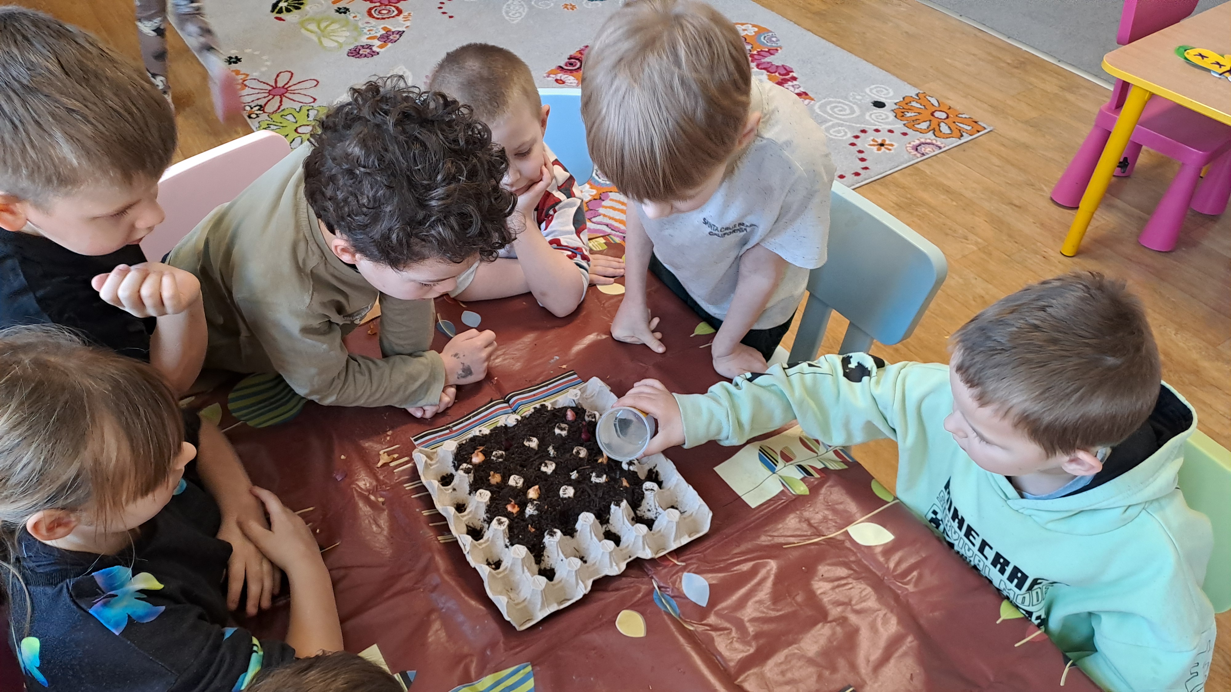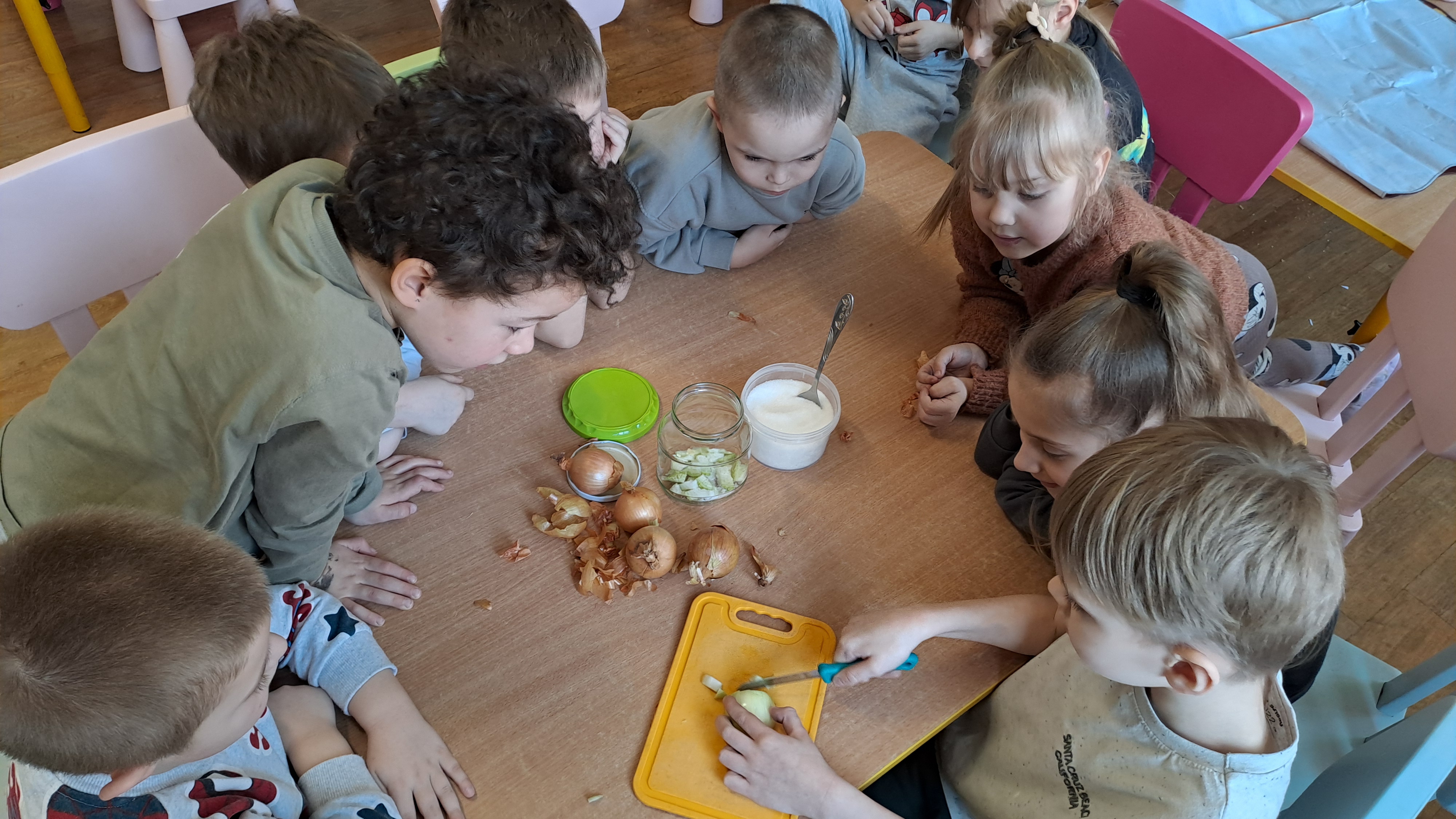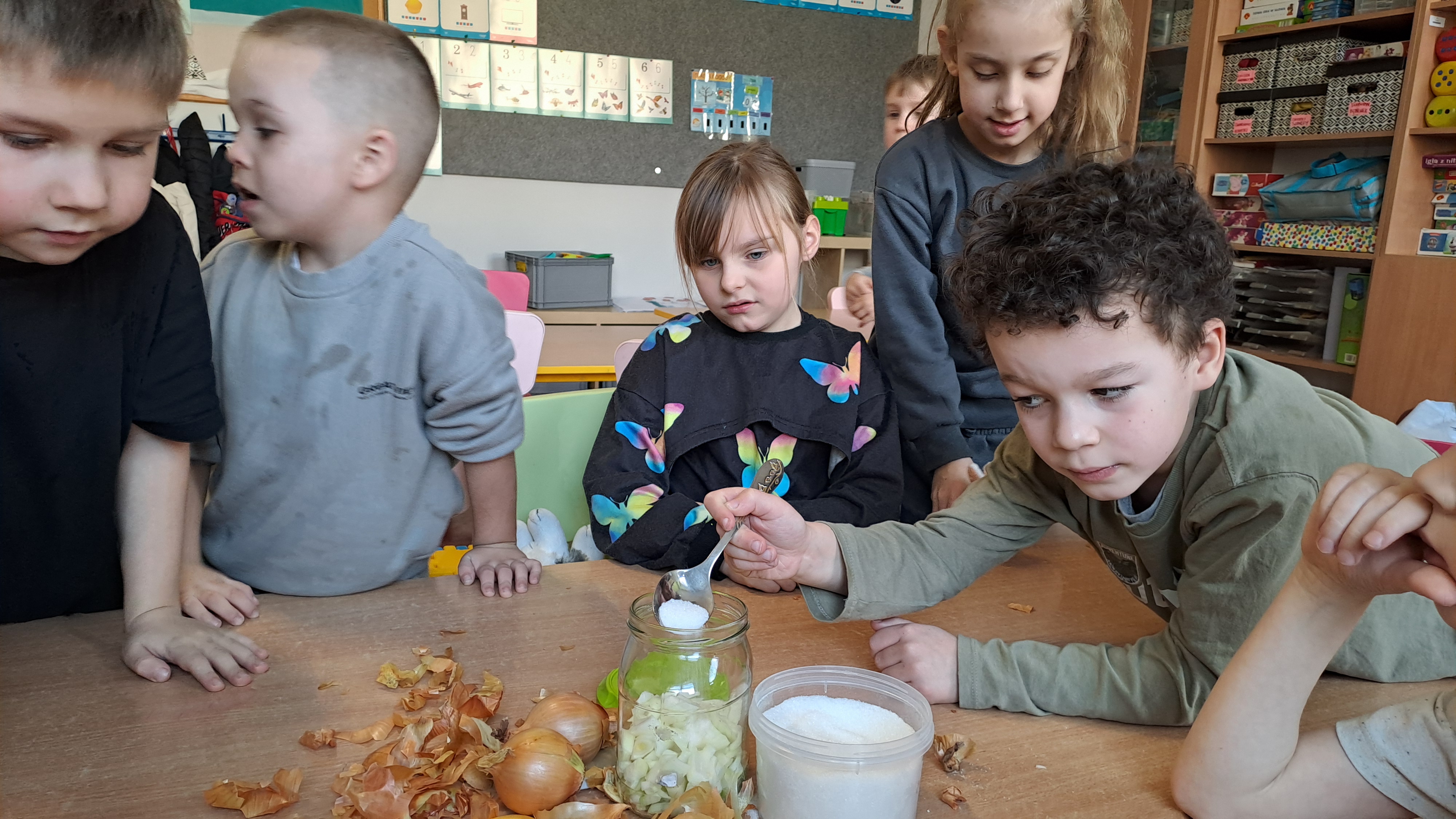 Na początku małe cebulki sadzimy, potem podlewamy i za szczypiokiem cierpliwie czekamy. On rośnie, a my go zjadamy.