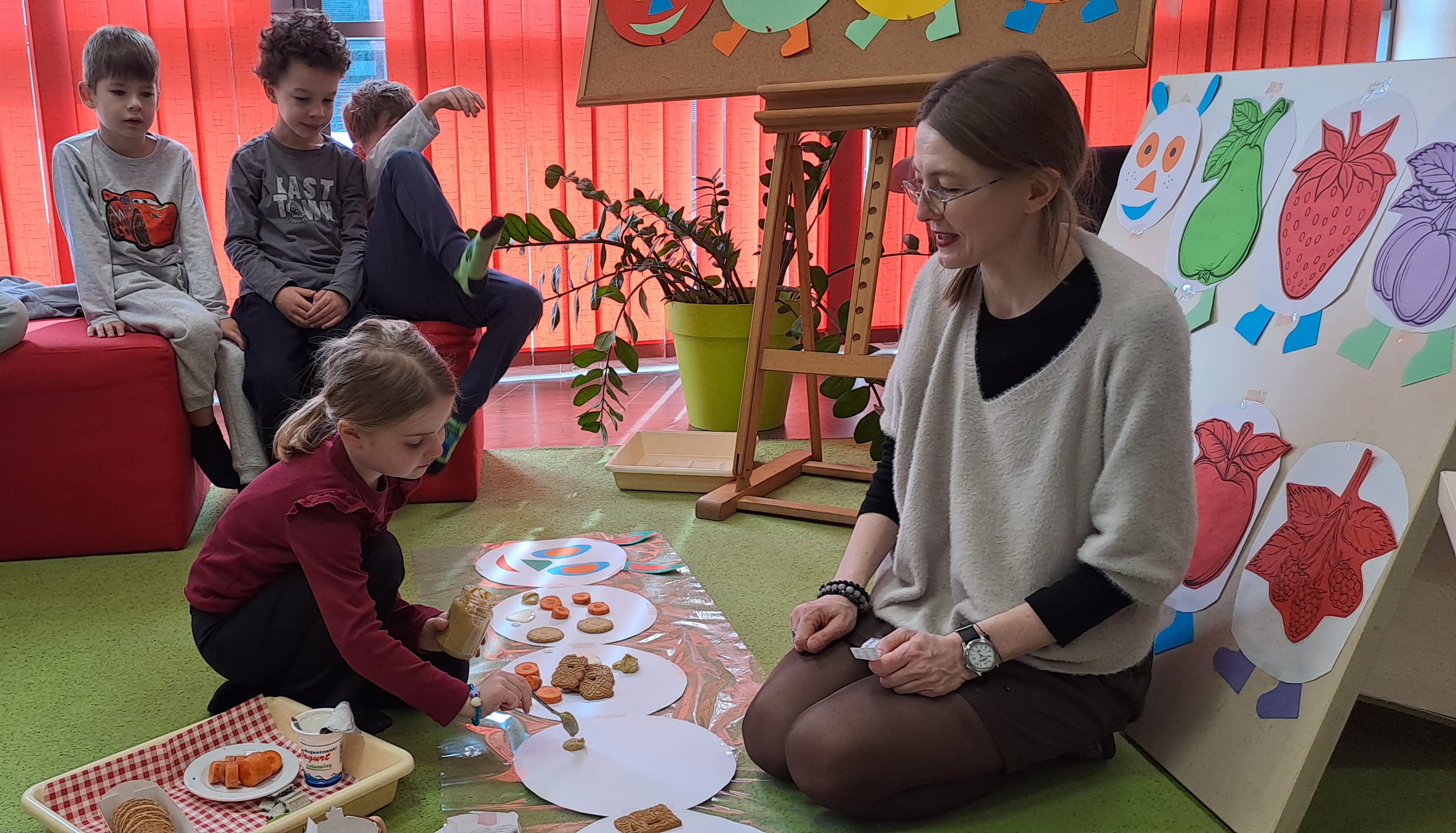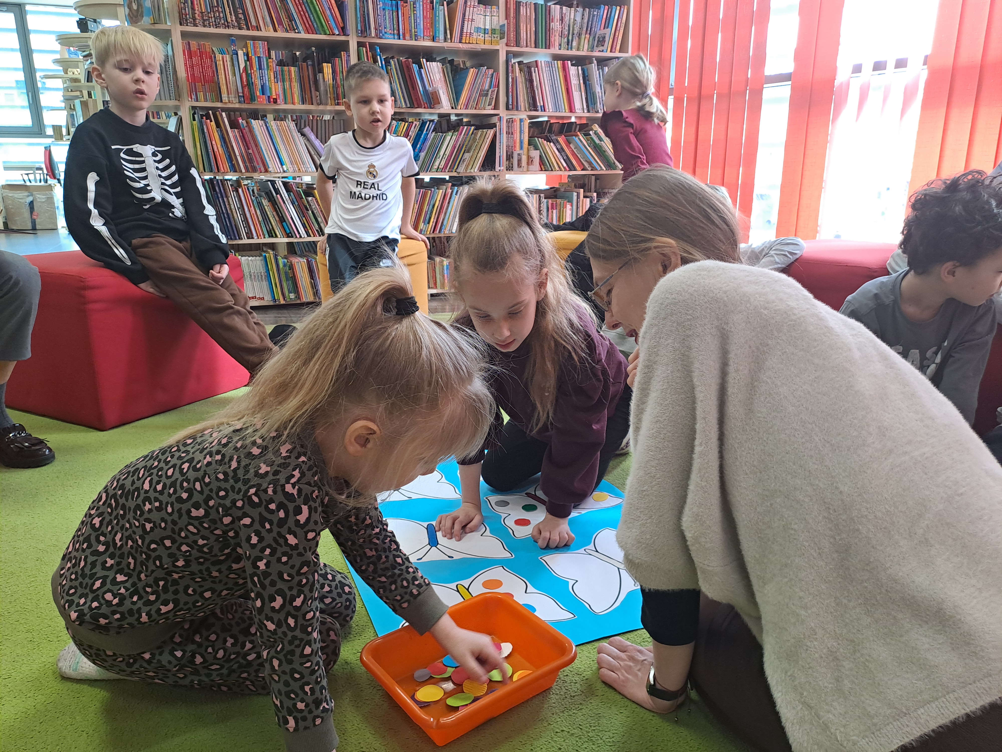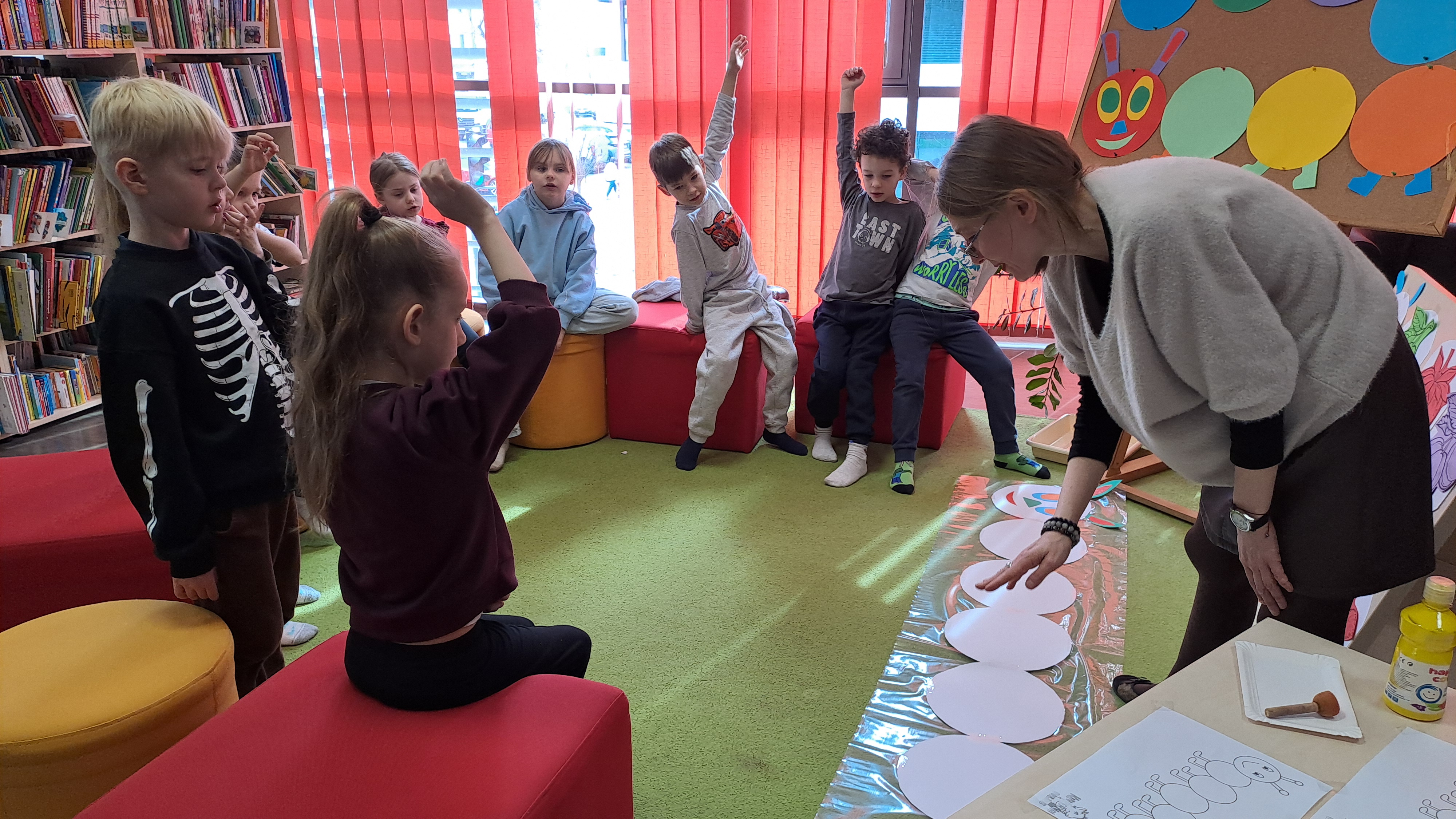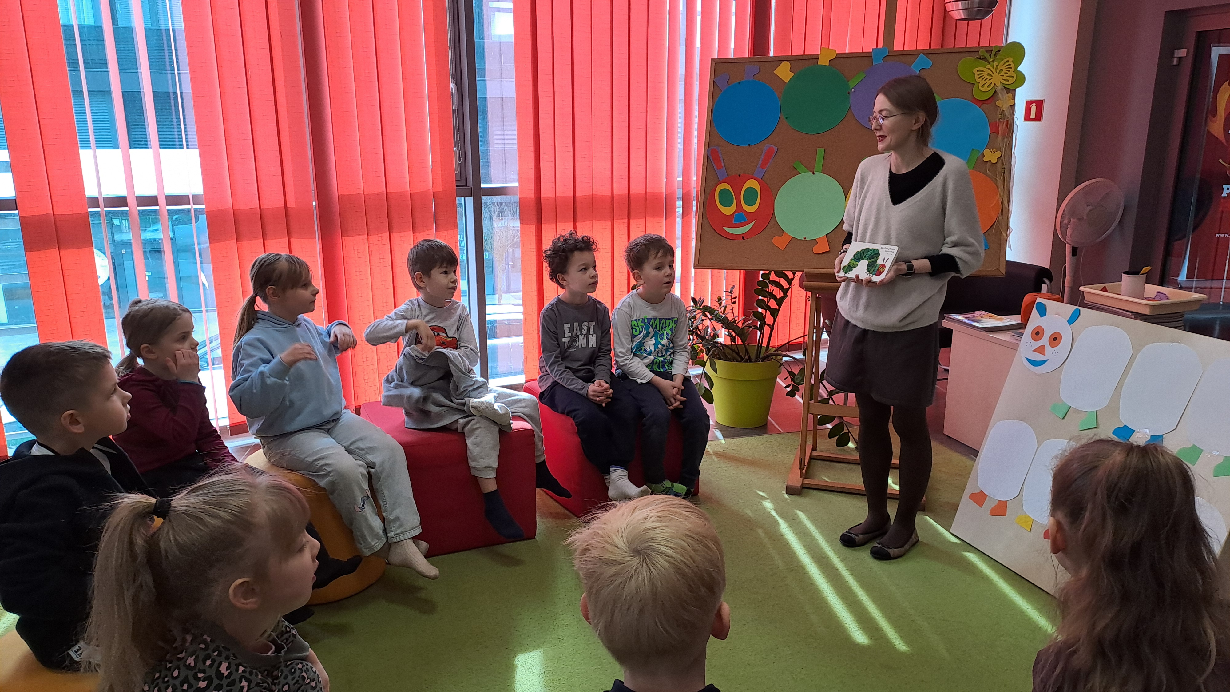 Przedszkolaki wzięły udział w zajęciach z twórczego myślenia ph: „Wszystkich cieszy nasza zmiana od wieczora aż do rana i od rana do wieczora, bo na zmianę zawsze pora”. Podczas spotkania dzieci wysłuchały książki Erica Carle, pt.: „Bardzo głodna gąsienica”. Razem z bohaterką książki poznawały liczby, kolory, dni tygodnia i swoje apetyty. Odpowiadały na pytania dotyczące tekstu. Następnie, rozwiązując zagadki o owocach, nakarmiły gąsienicę, która na zakończenie spotkania zamieniła się w motyla. Dzieci ozdobiły go kolorowymi ciapkami. Bardzo dziękujemy za ciekawe, kreatywne zajęcia.