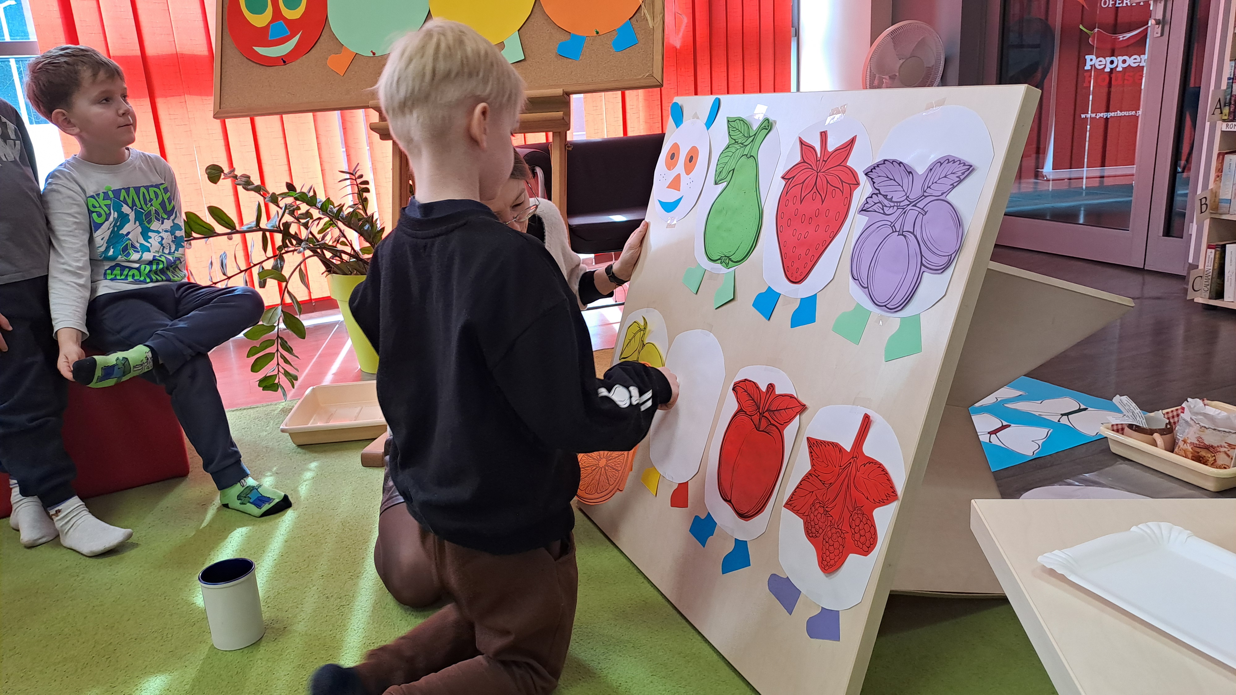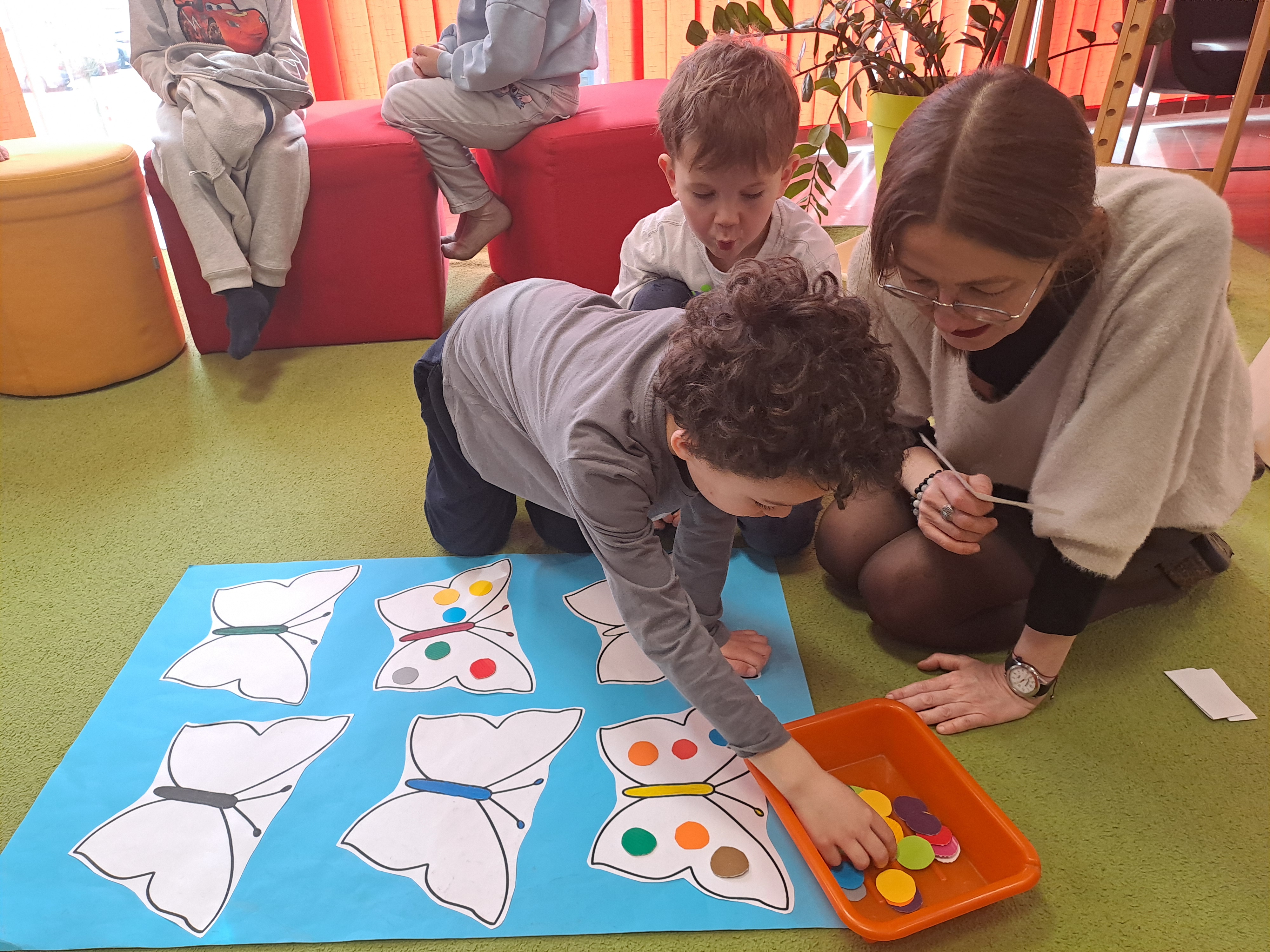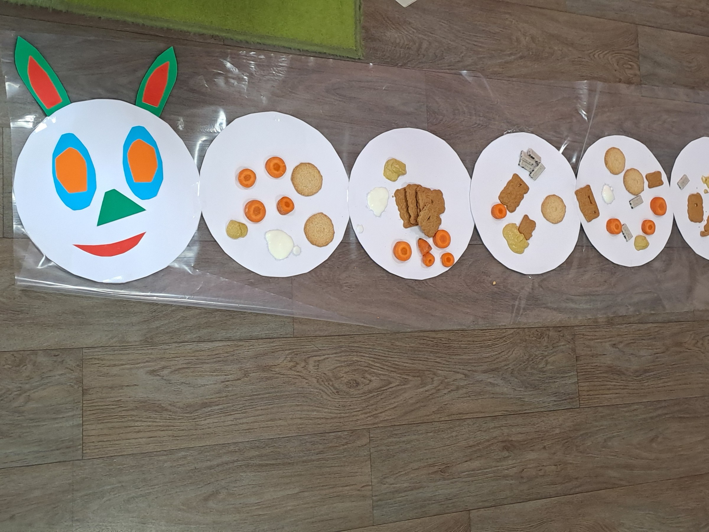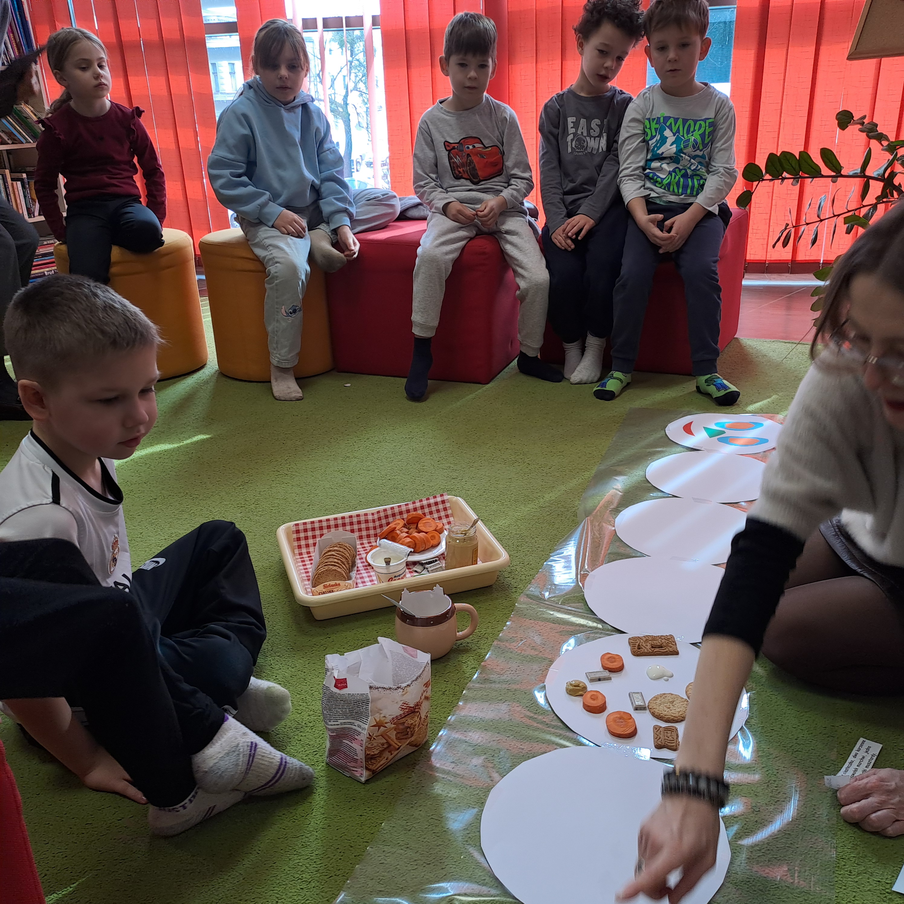 Przedszkolaki wzięły udział w zajęciach z twórczego myślenia ph: „Wszystkich cieszy nasza zmiana od wieczora aż do rana i od rana do wieczora, bo na zmianę zawsze pora”. Podczas spotkania dzieci wysłuchały książki Erica Carle, pt.: „Bardzo głodna gąsienica”. Razem z bohaterką książki poznawały liczby, kolory, dni tygodnia i swoje apetyty. Odpowiadały na pytania dotyczące tekstu. Następnie, rozwiązując zagadki o owocach, nakarmiły gąsienicę, która na zakończenie spotkania zamieniła się w motyla. Dzieci ozdobiły go kolorowymi ciapkami. Bardzo dziękujemy za ciekawe, kreatywne zajęcia.