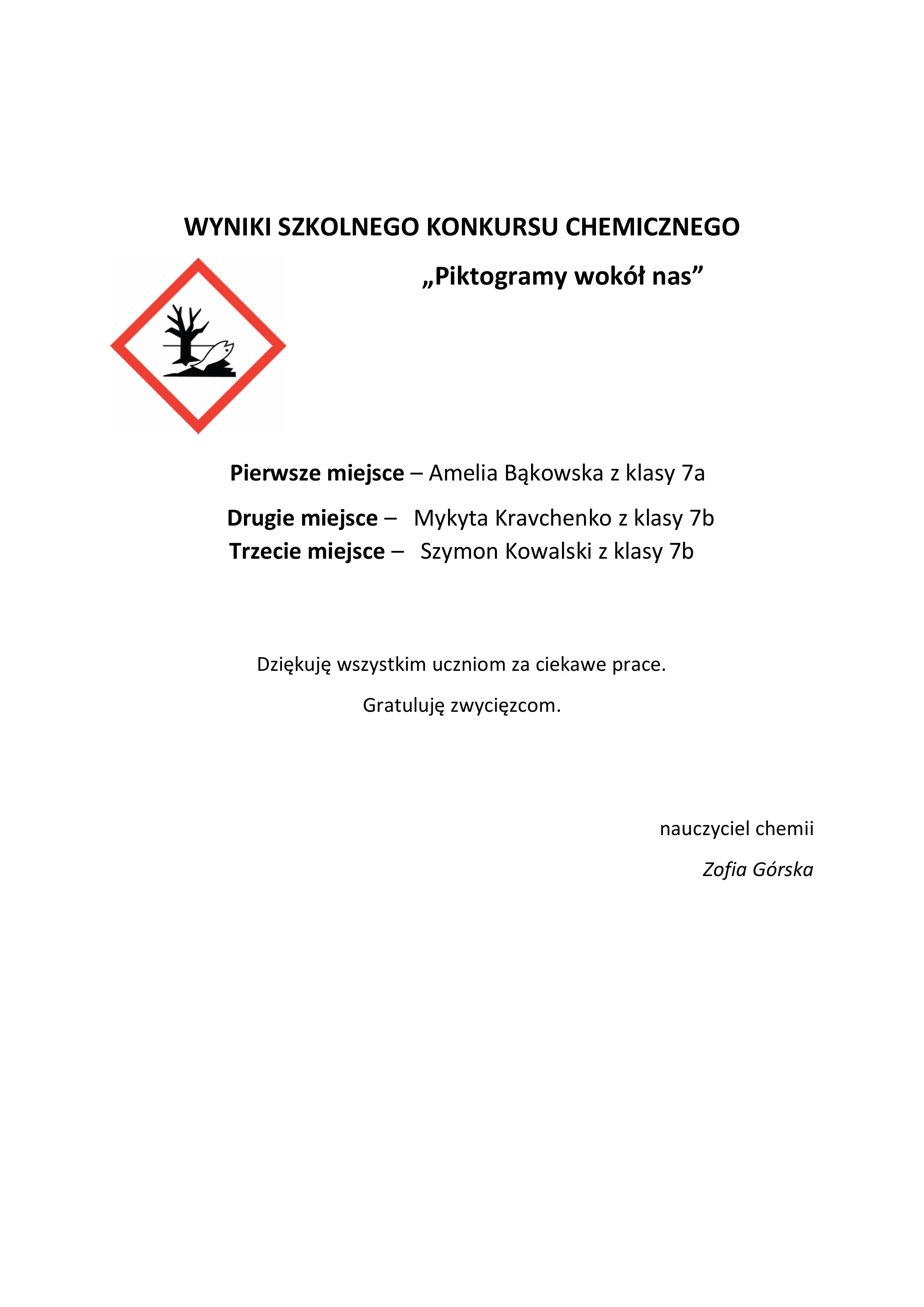 WYNIKI SZKOLNEGO KONKURSU CHEMICZNEGO „Piktogramy wokół nas”